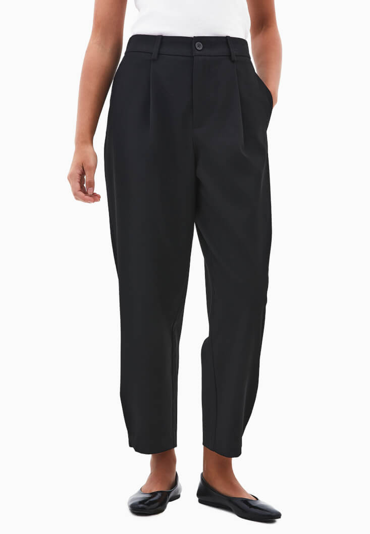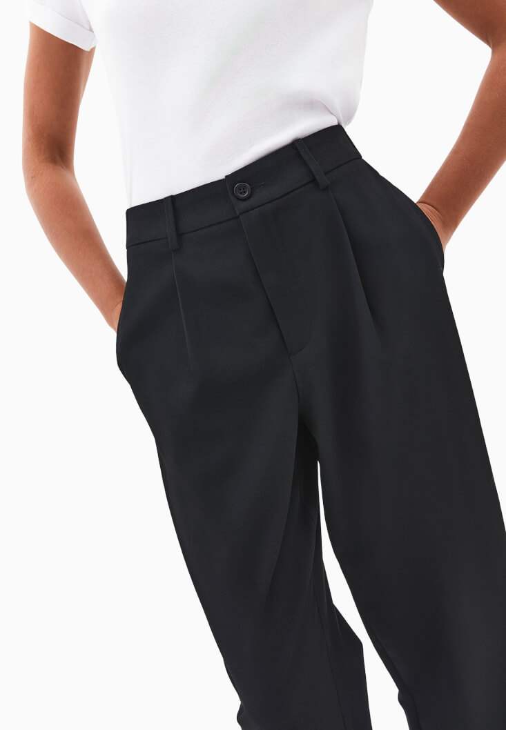 Viskon karışımlı özel doku, ultra yüksek bel, bedenden uzak balon fit, ön bel kısmı pile detaylı, havuç kesim paça, iki cepli, arka bel kısmı lastikli.