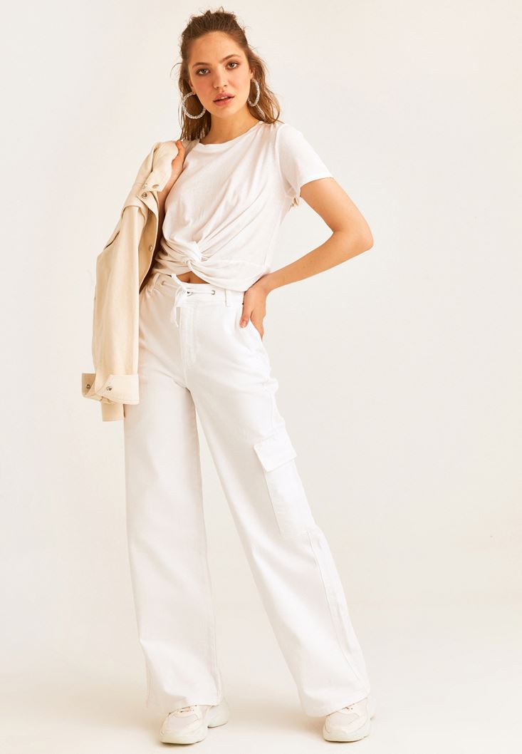 Beyaz Ultra Yüksek Bel Bol Pantolon