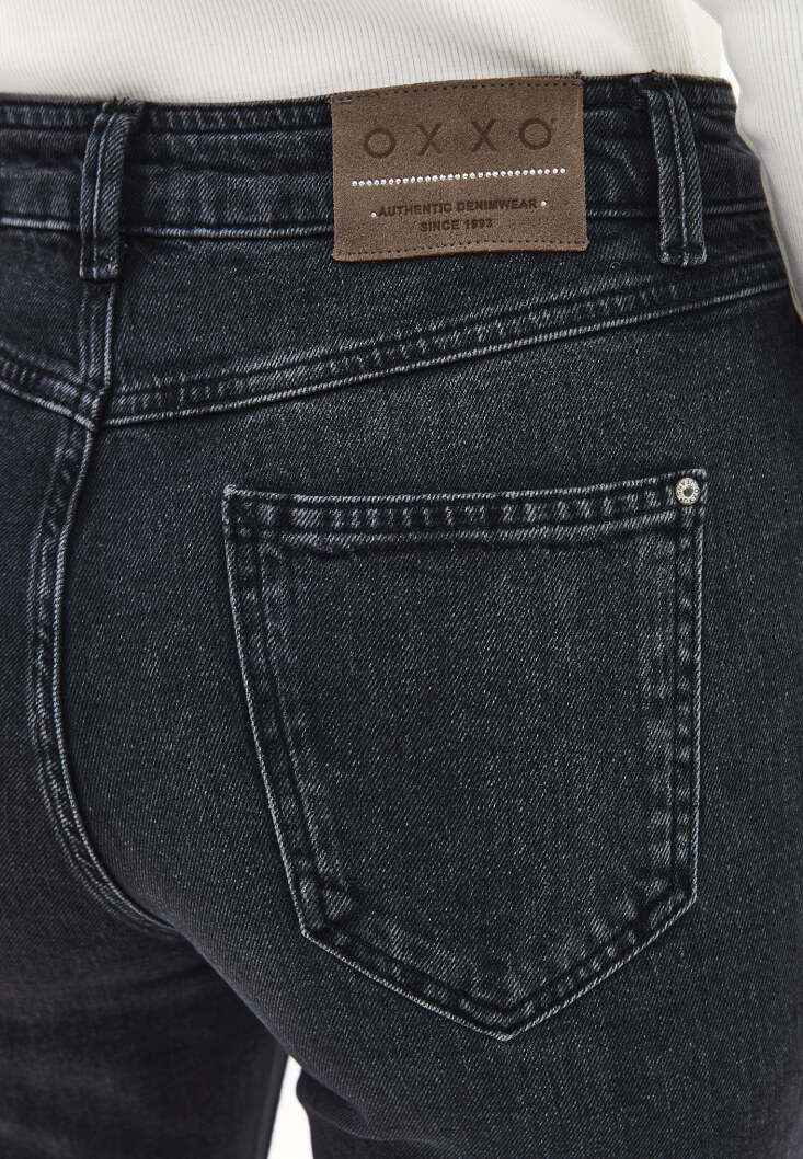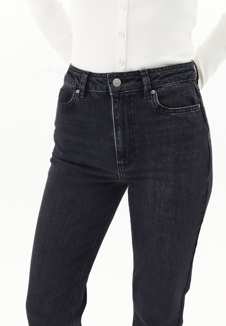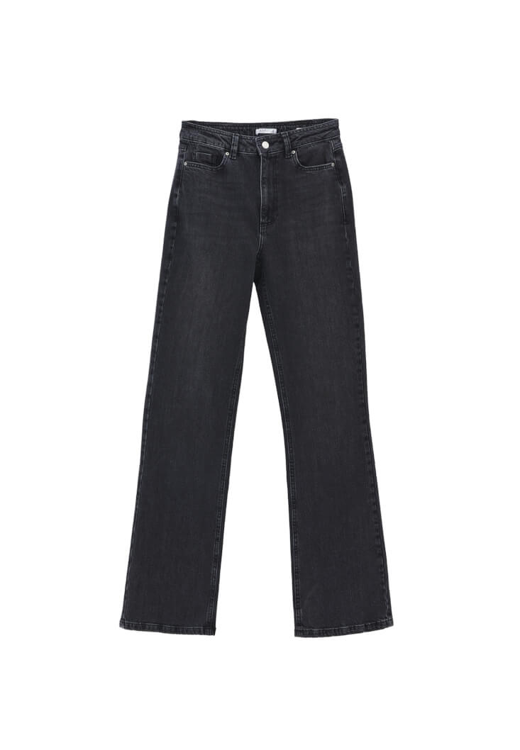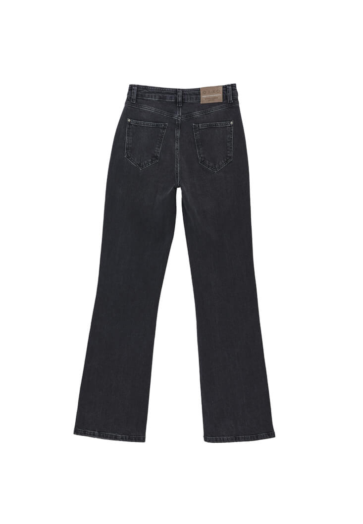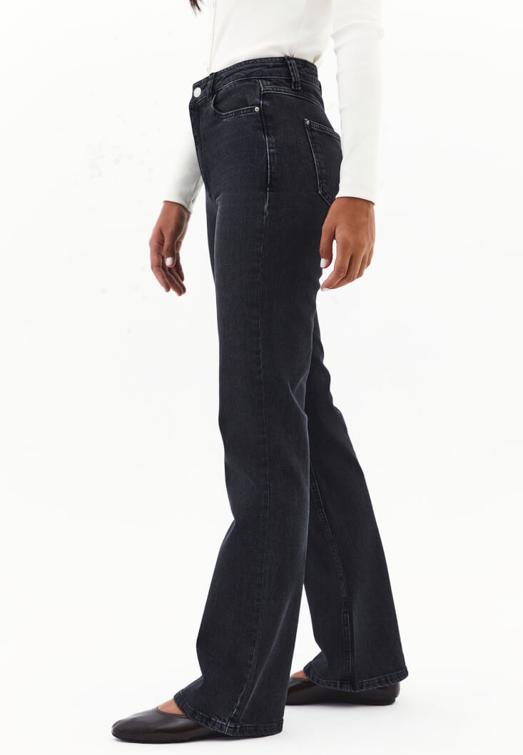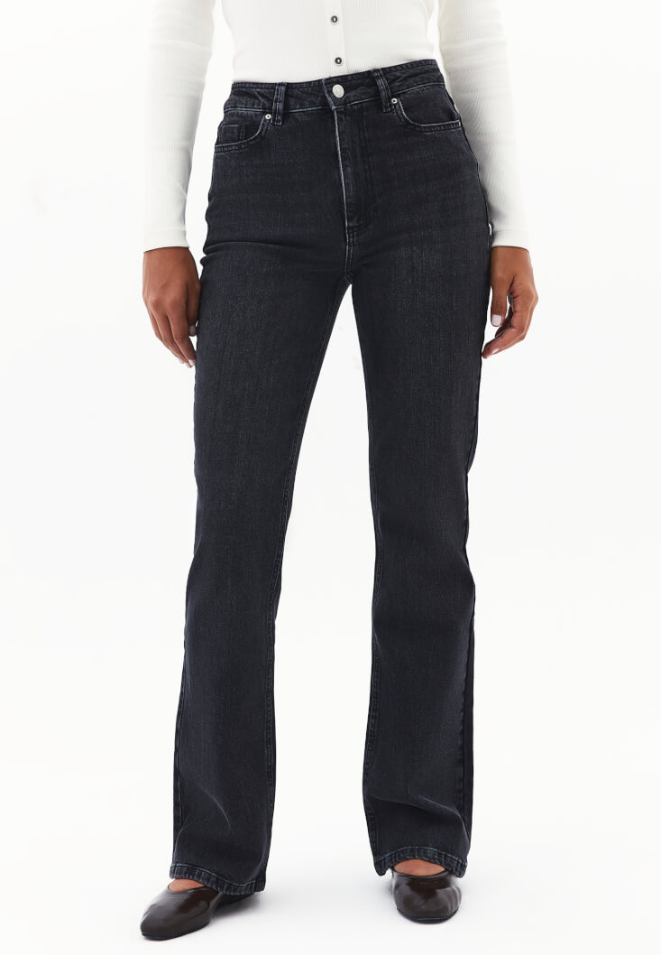 Pamuk karışımlı esnek doku, bedene yakın fit, bot paça, ultra yüksek bel, önü ve arkası ikişer cepli, yıkama görünümlü.