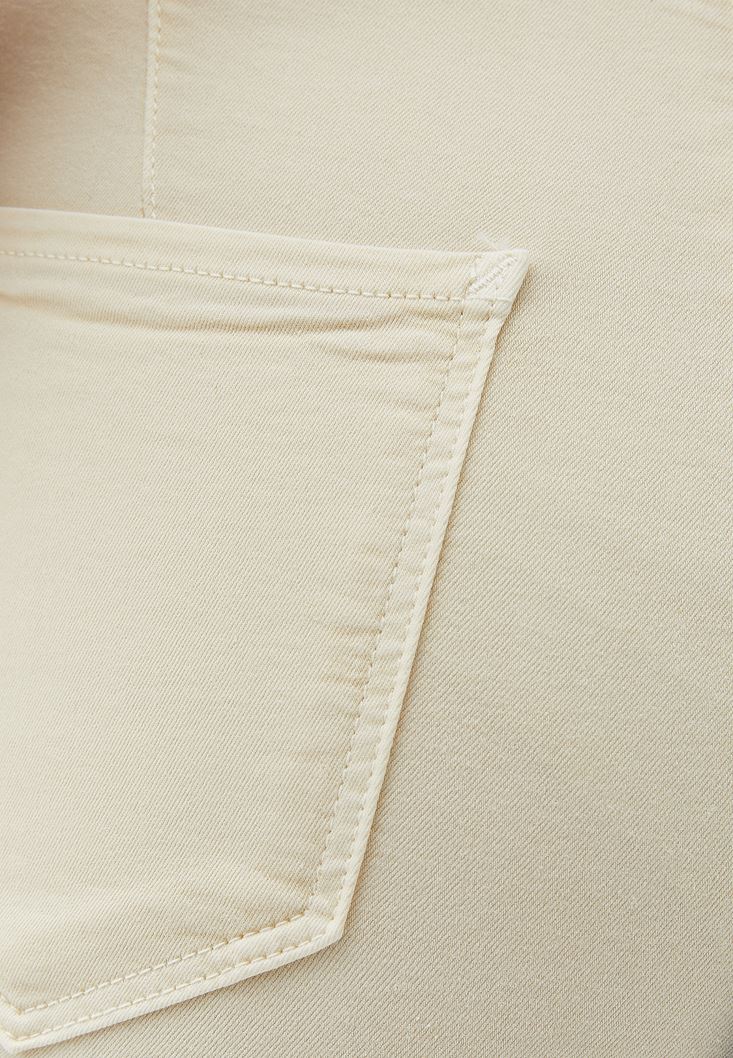 Pamuk ve viskon karışımlı doku, bedeni saran esnek fit, ultra yüksek bel, İspanyol paça, yan kısmı fermuarlı, arkası iki cepli.