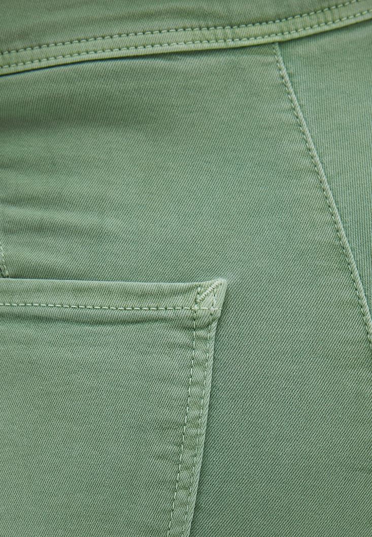 Pamuk ve viskon karışımlı doku, bedeni saran esnek fit, ultra yüksek bel, İspanyol paça, yan kısmı fermuarlı, arkası iki cepli.