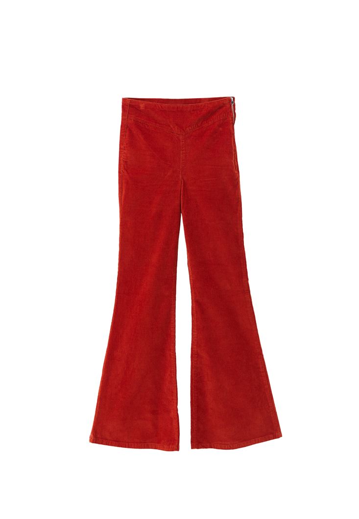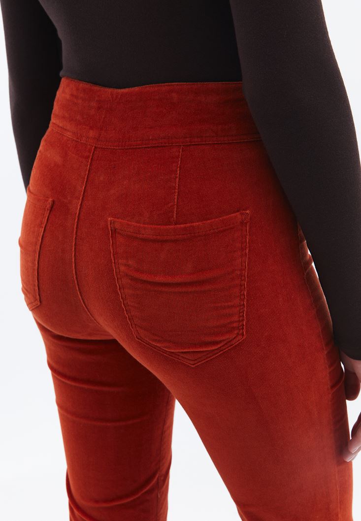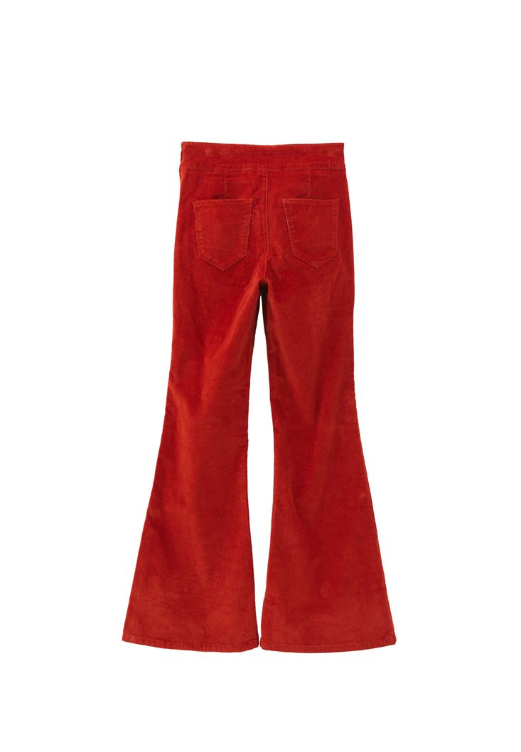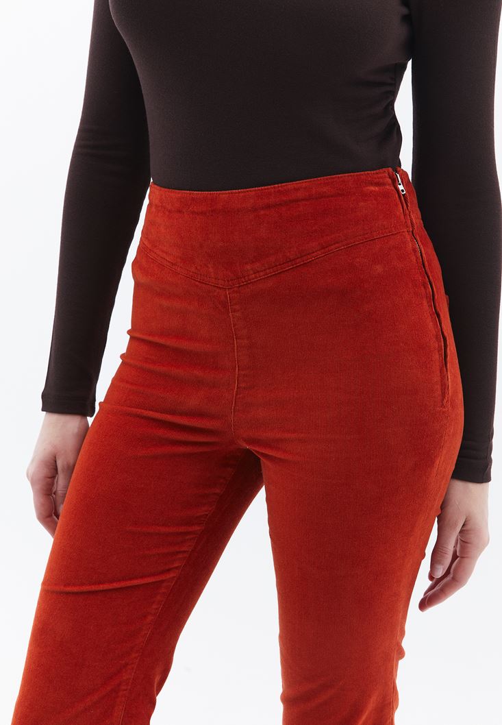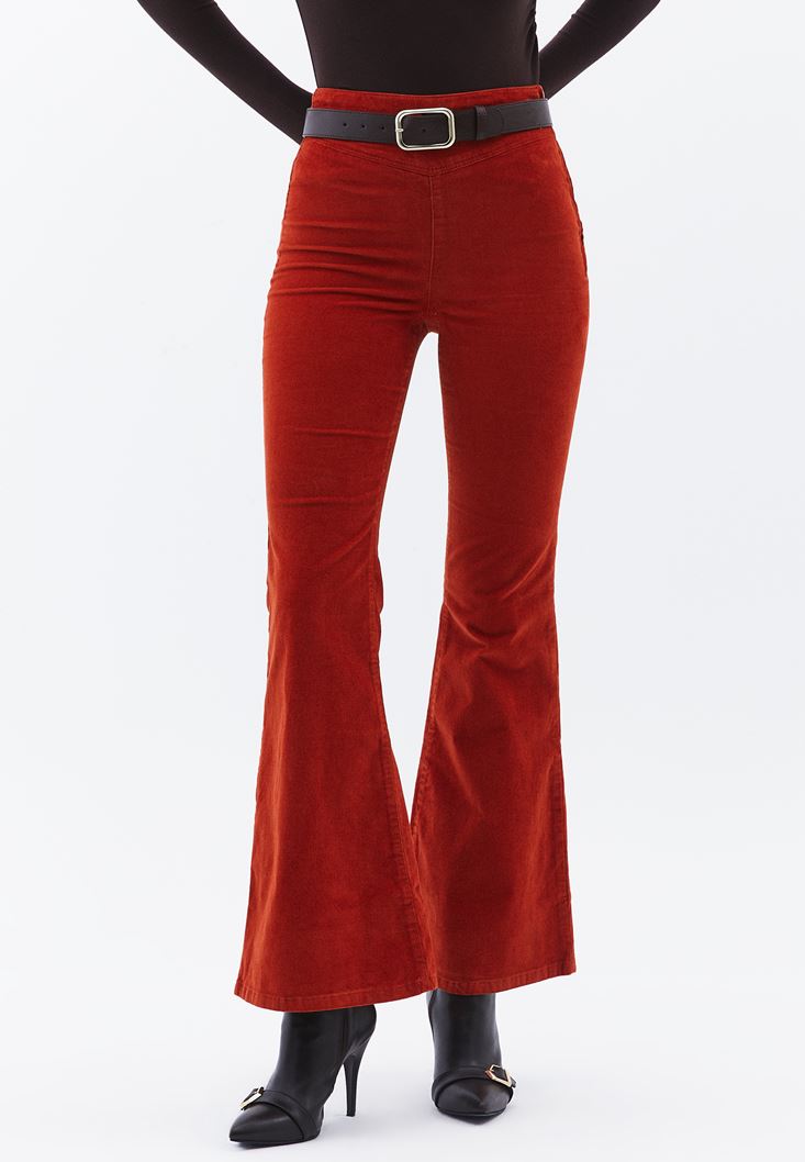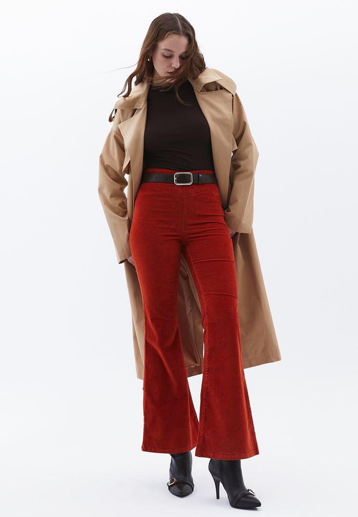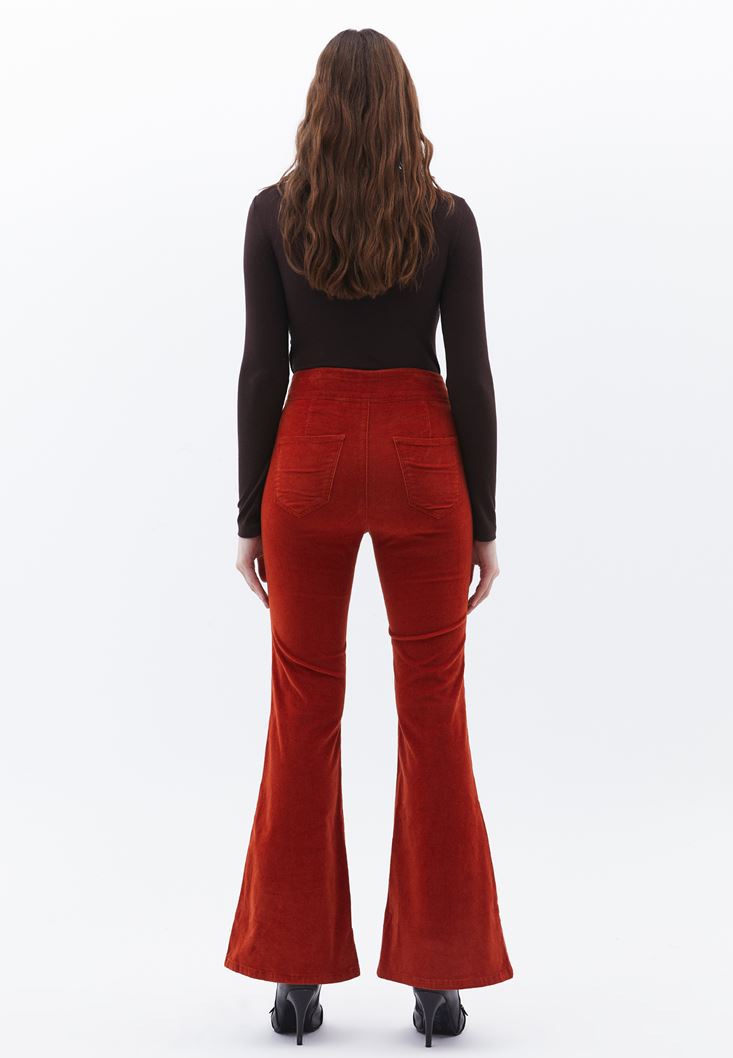 Pamuk karışımlı kadife doku, ultra yüksek bel, İspanyol paça, yan bel kısmı fermuarlı, arkası iki cepli, bedene yakın flare fit.