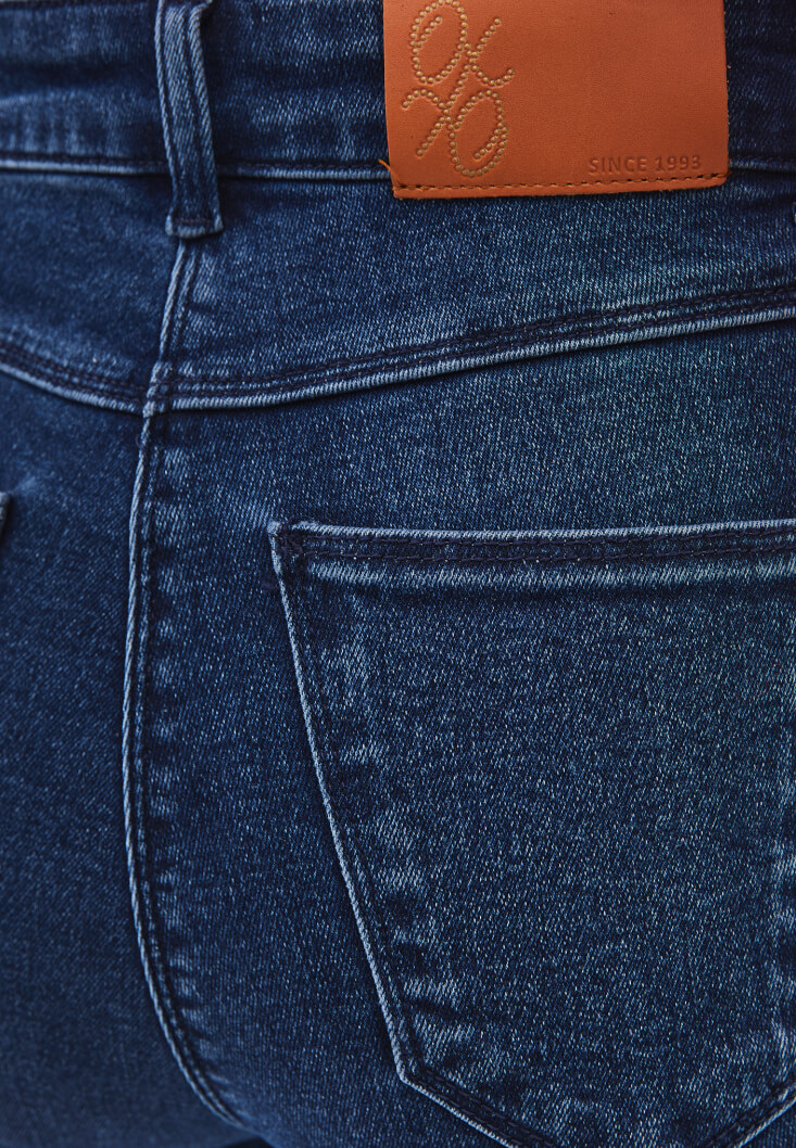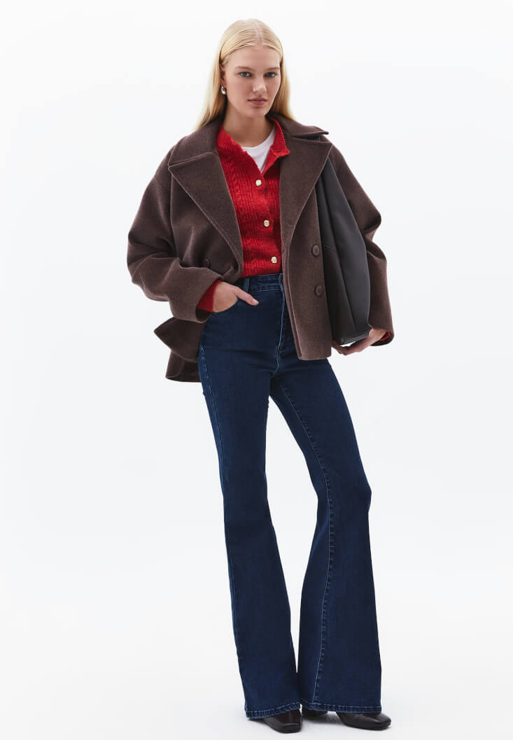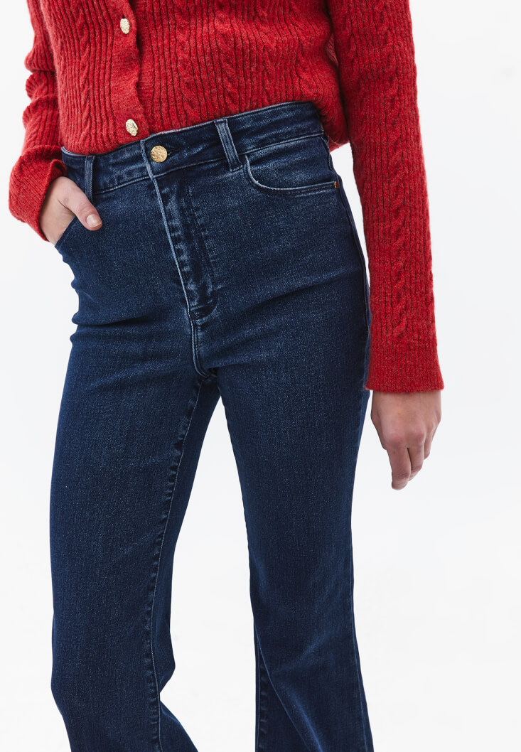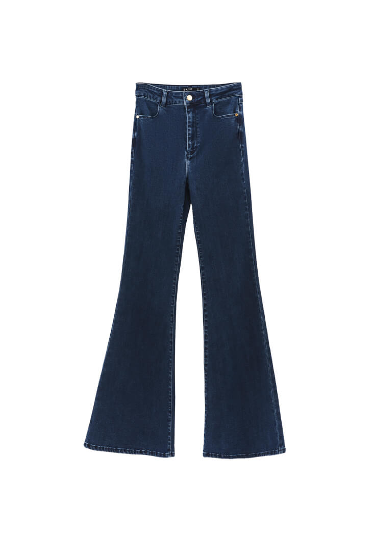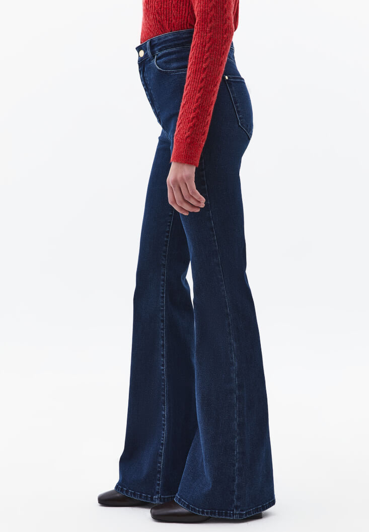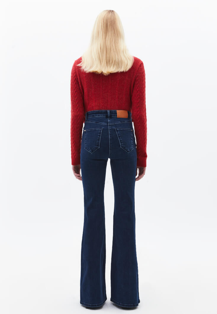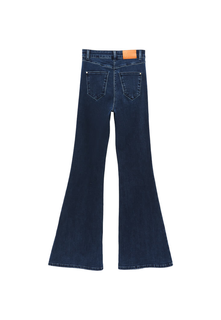 Pamuk karışımlı denim, esnek fit, ultra yüksek bel, ispanyol paça, önü ve arkası cep detaylı.
