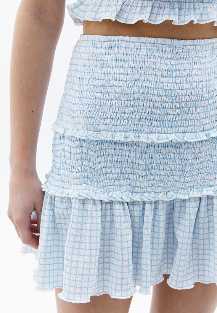 Gipeli esnek doku, mini boy kesim, ultra yüksek bel, pötikare desenli, katlı kesim, beli lastikli.