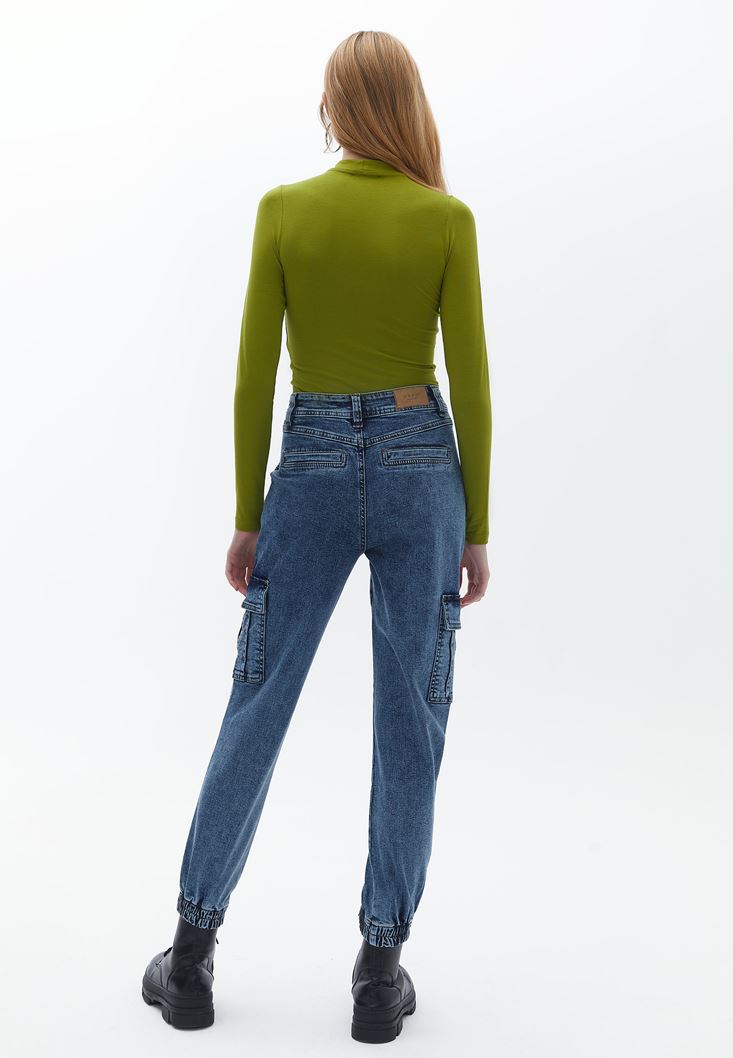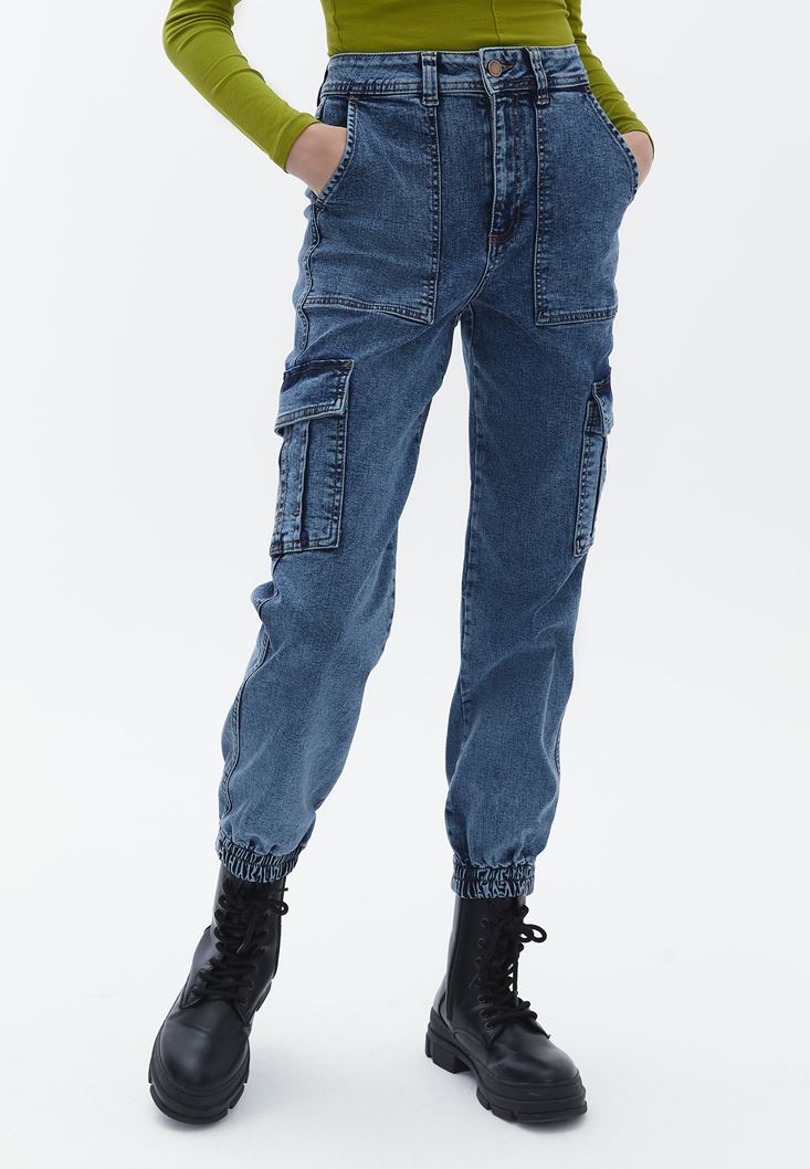 Pamuk içerikli denim doku, ultra yüksek bel, bedenden uzak jogger fit, kargo cepli, paçası lastikli, ön kısmı iki cepli, arka kısmı cep görünümlü.