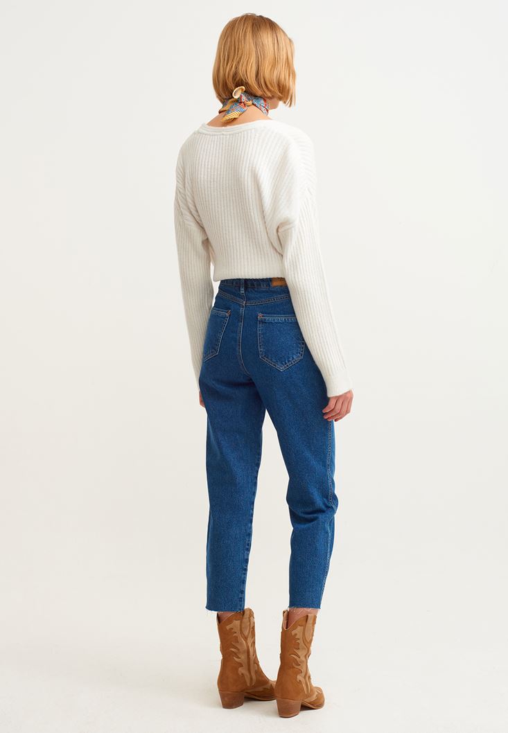 %100 pamuklu denim doku, ultra yüksek bel, mom-fit, slim paça, bedene yakın rahat form, önü ve arkası iki cepli.