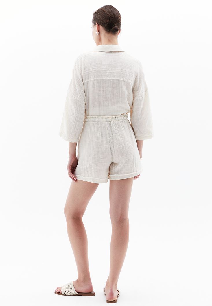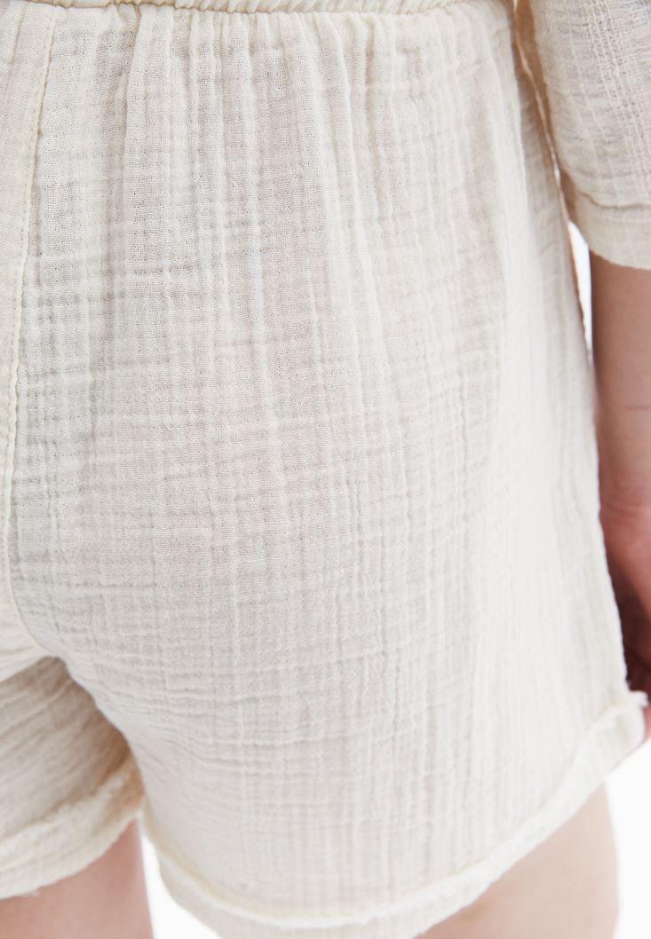 %100 pamuk içerikli doğal doku, ultra yüksek bel, bedenden uzak rahat fit, beli lastikli ve bağcıklı, mini kesim, iki cepli.