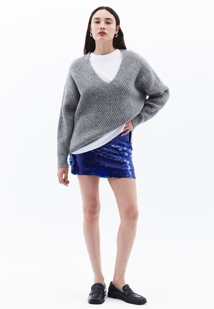 Işıltılı payet doku, bedene yakın fit, mini kesim, beli lastikli, içi astarlı.