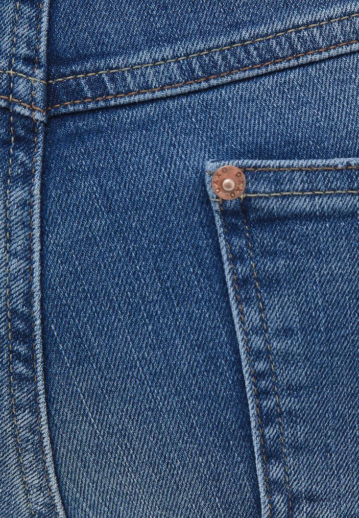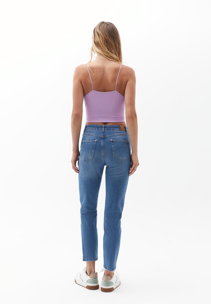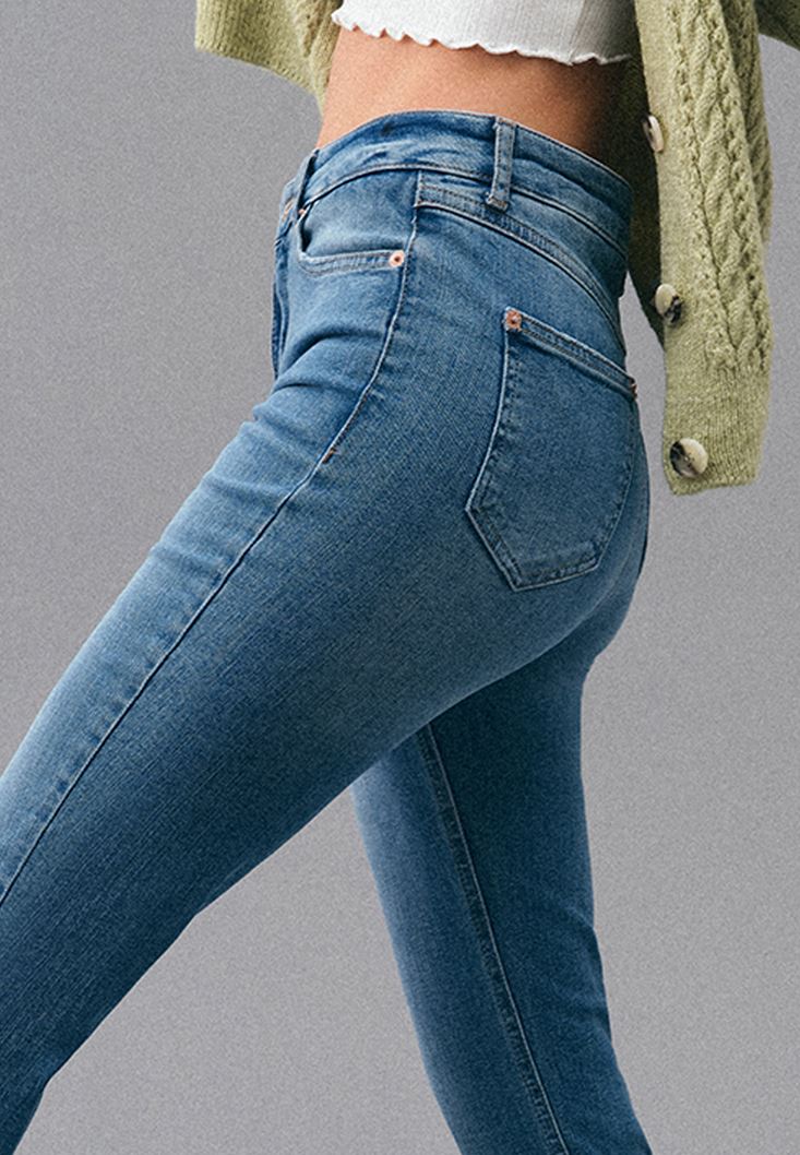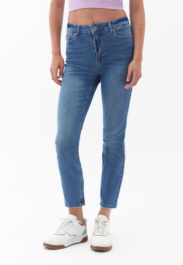 Pamuklu denim doku, ultra yüksek bel, slim paça, bedene yakın fit, bilekte biten paça boyu, önü ve arkası iki cepli.