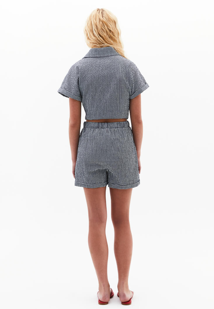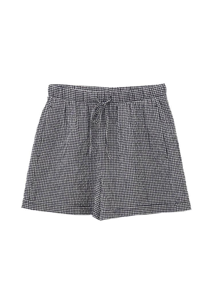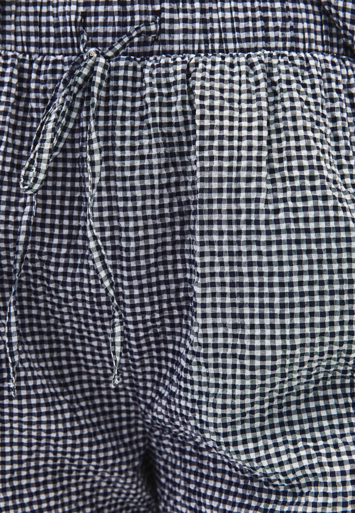 Pamuk karışımlı özel doku, pötikare desenli, bedene yakın rahat fit, ultra yüksek bel, duble paça detaylı, beli lastikli ve bağcıklı, iki cepli, mini kesim.