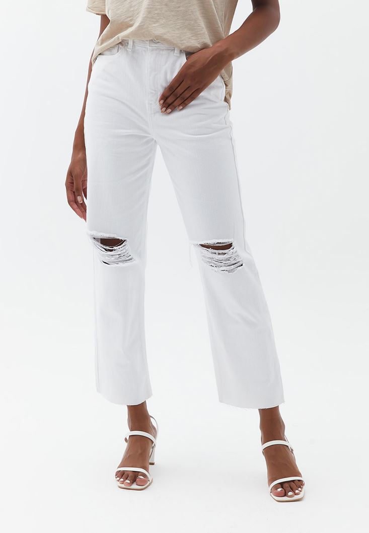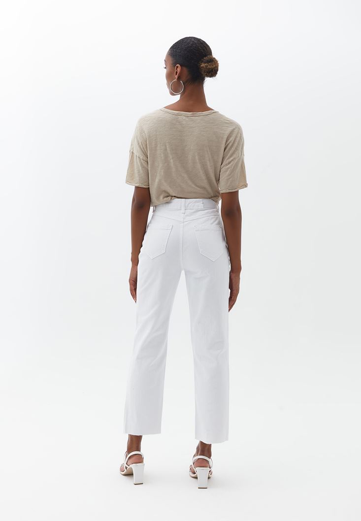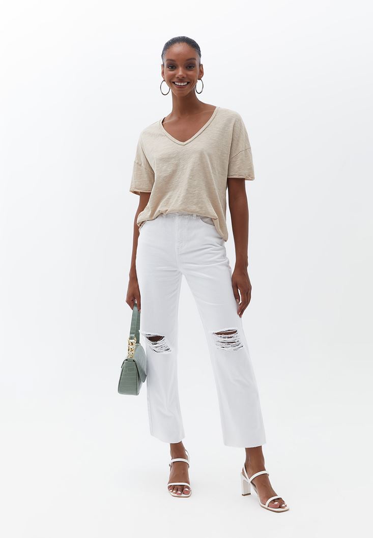 %100 pamuklu doğal doku, ultra yüksek bel, bedene yakın straight fit, boru paça, diz kısmı yırtık detaylı, önü ve arkası iki cepli.