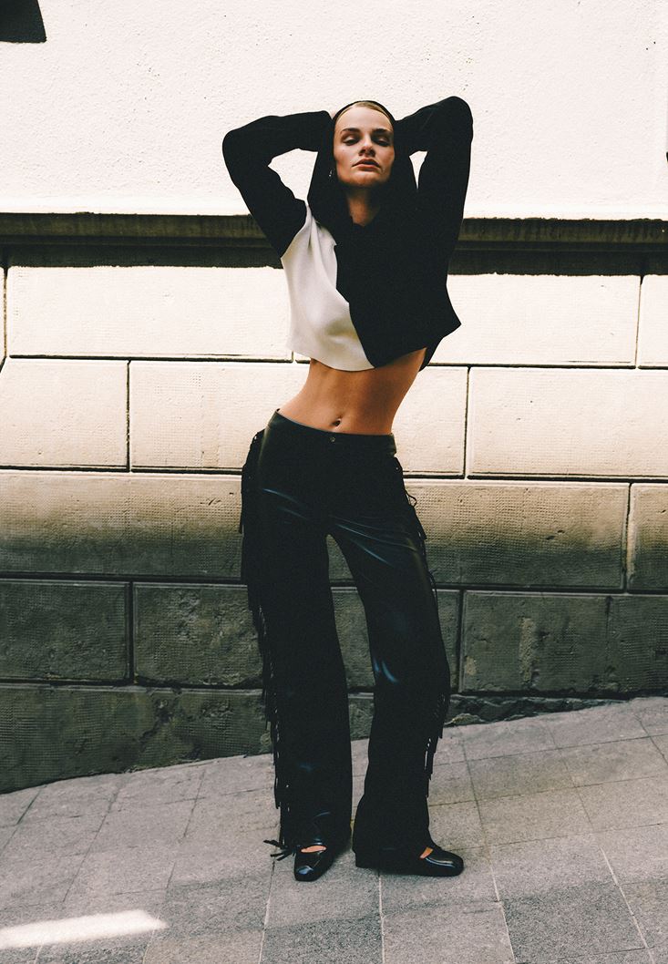 Vegan derinin cazibesini keşfetmeye hazır mısınız? Bunun için ihtiyacınız olan straight fit deri pantolon modeli ile tanışmanız yeterli… Püskül detaylı görünümüyle western modasına göz kırpan bu parçayı; aynı dokudaki vegan deri ceketlerle ve botlarla birleştirmek güçlü bir stil yaratmanıza yardımcı olabilir. Vegan derinin asi ve etkileyici etkisi için hemen bu pantolonu gardırobunuza dahil edin!😘