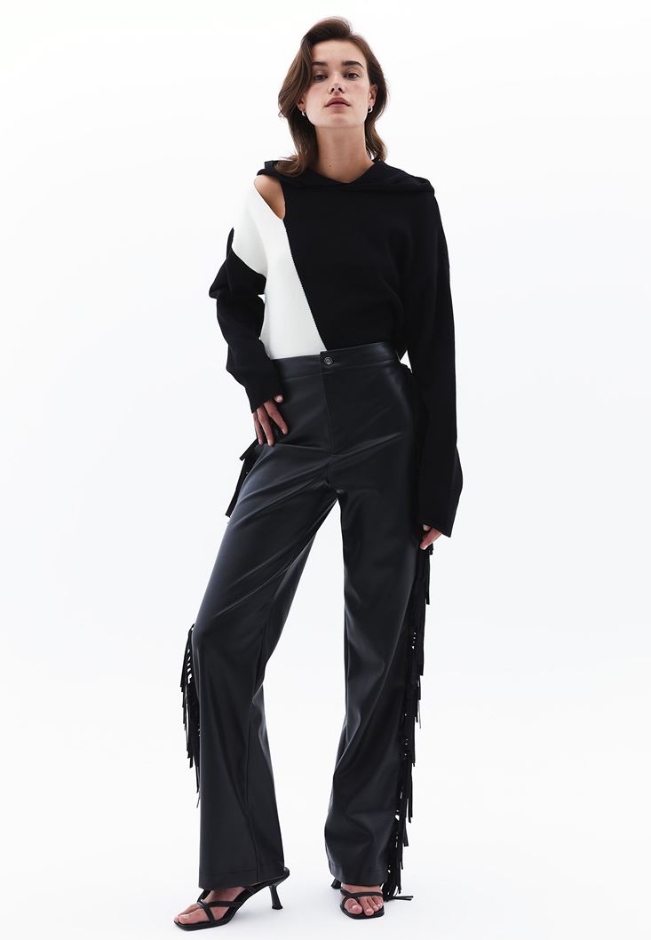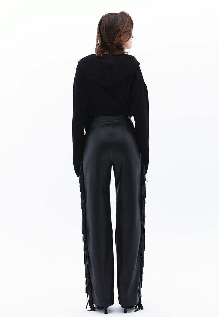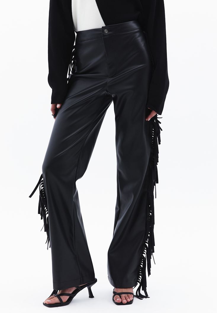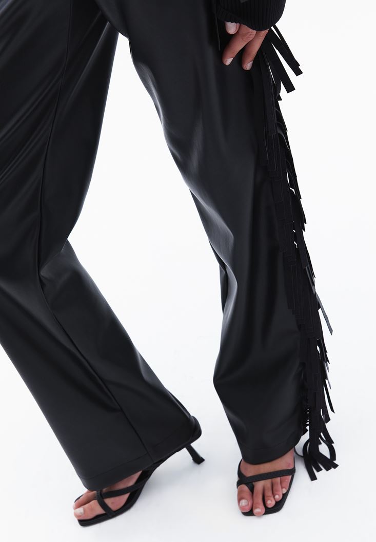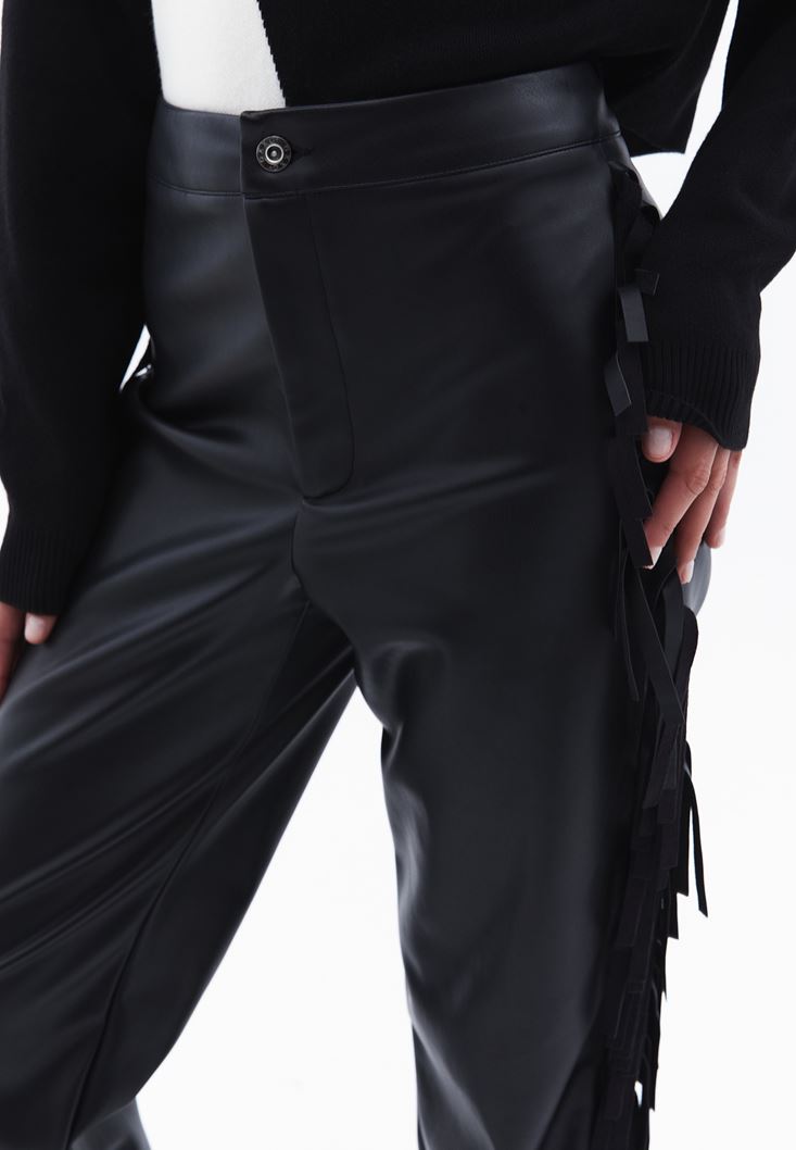 Vegan deri doku, yan beden kısımları püskül detaylı, ultra yüksek bel, bedenden uzak straight fit, boru paça.