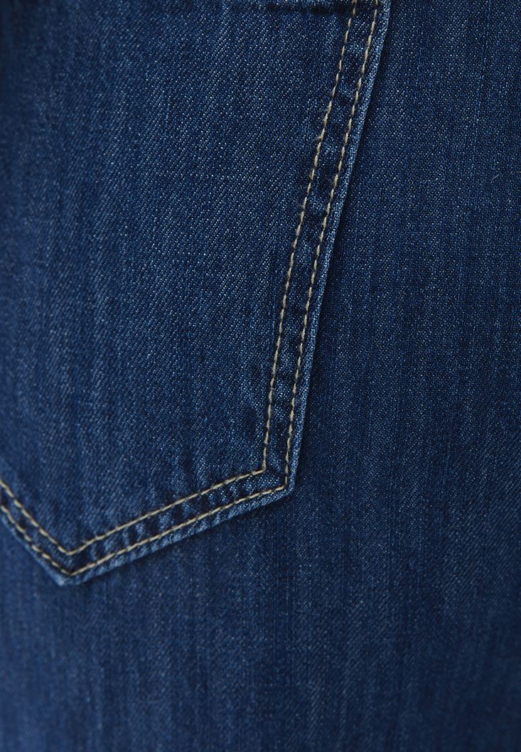 %100 pamuklu denim, ultra yüksek bel, ön kısmı pileli ve düğme detaylı, önü ve arkası iki ceple, bol paça, bedenden uzak fit.