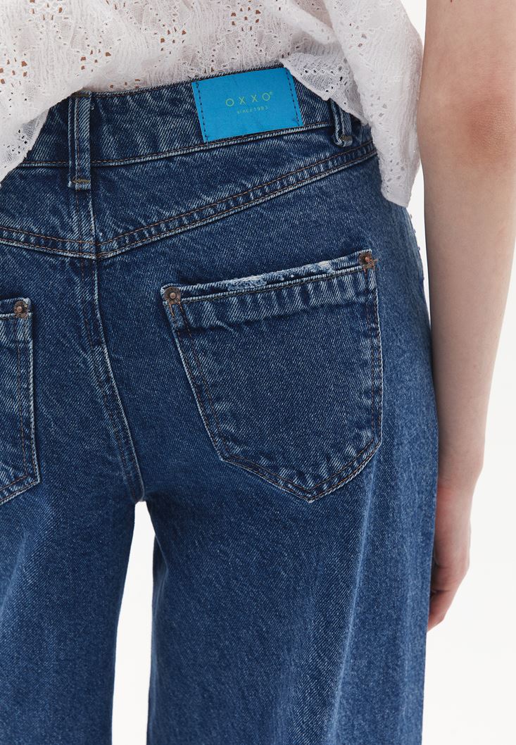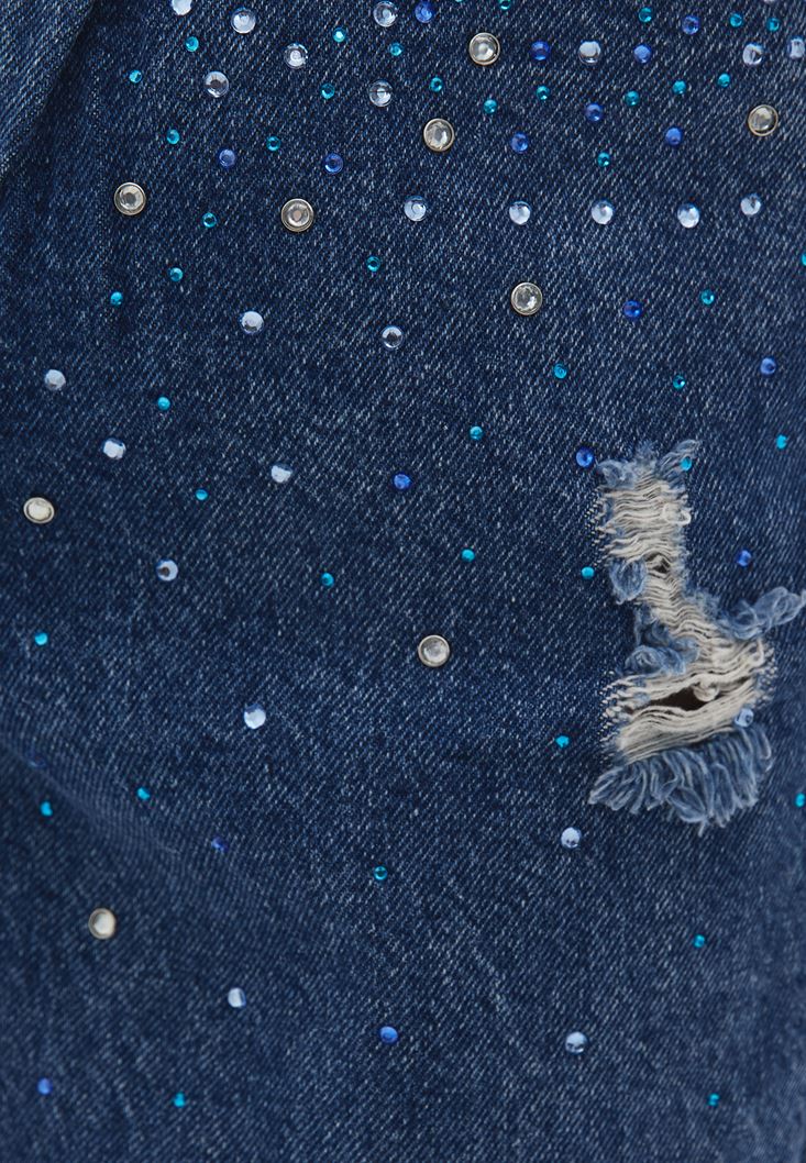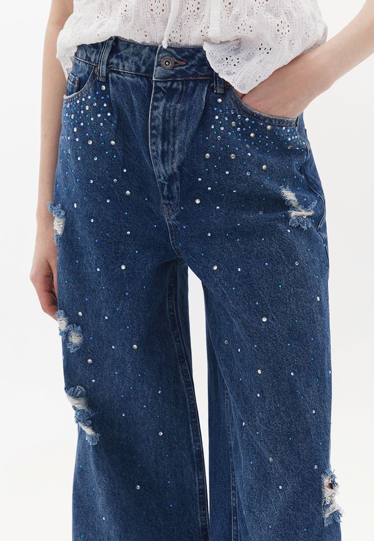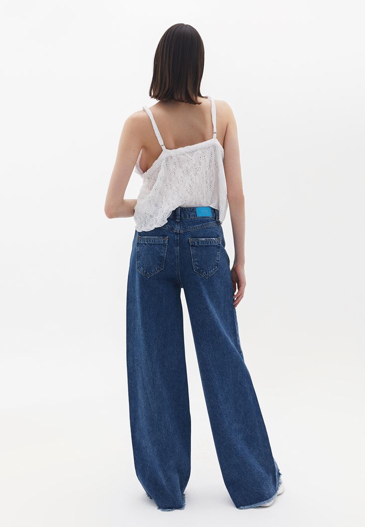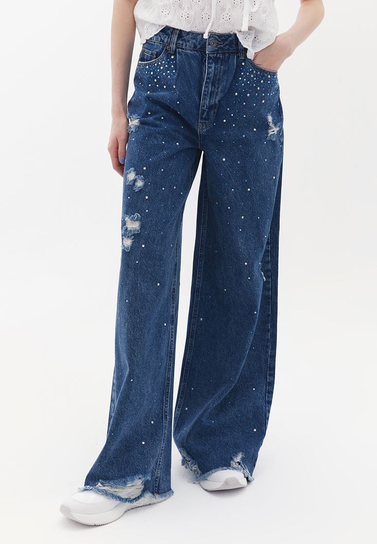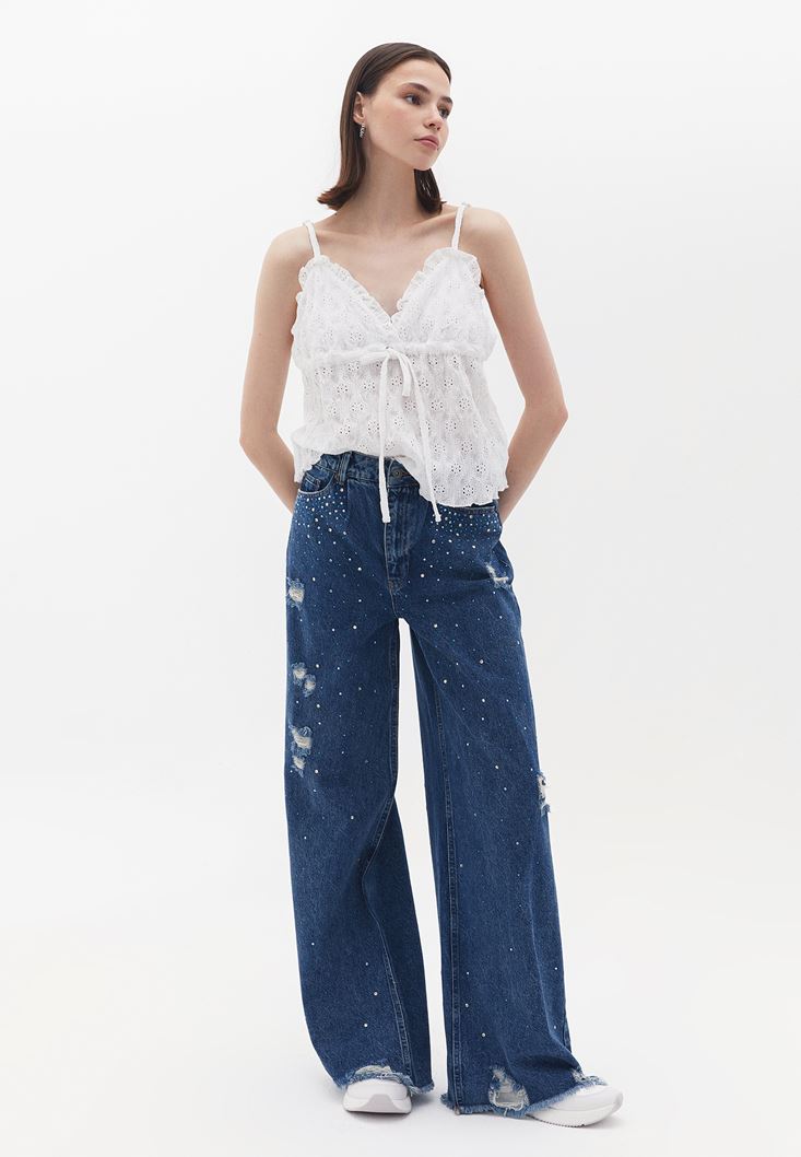 %100 pamuklu denim, taş işlemeli, ultra yüksek bel, bedenden uzak wide fit, bol paça, ön kısmı ve paçası cut out detaylı, önü ve arkası iki cepli.