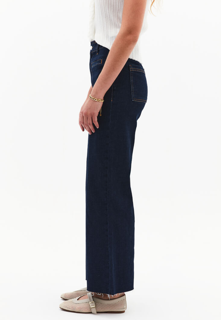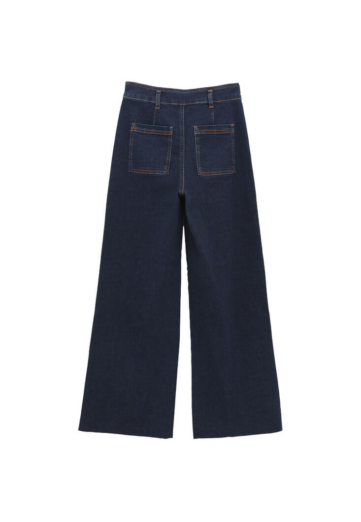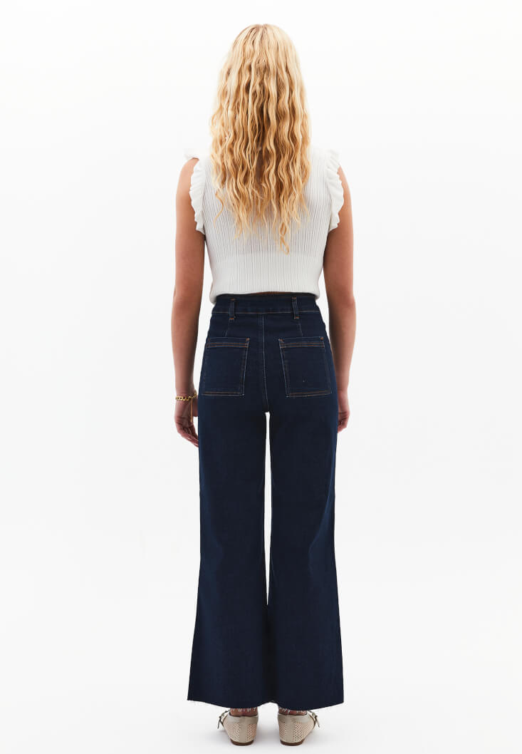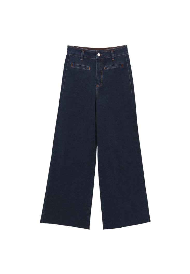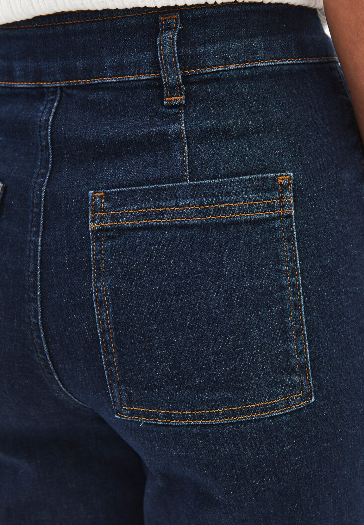 Pamuk karışımlı denim, ultra yüksek bel, bol paça, bedenden uzak rahat fit, kısa paça detaylı.