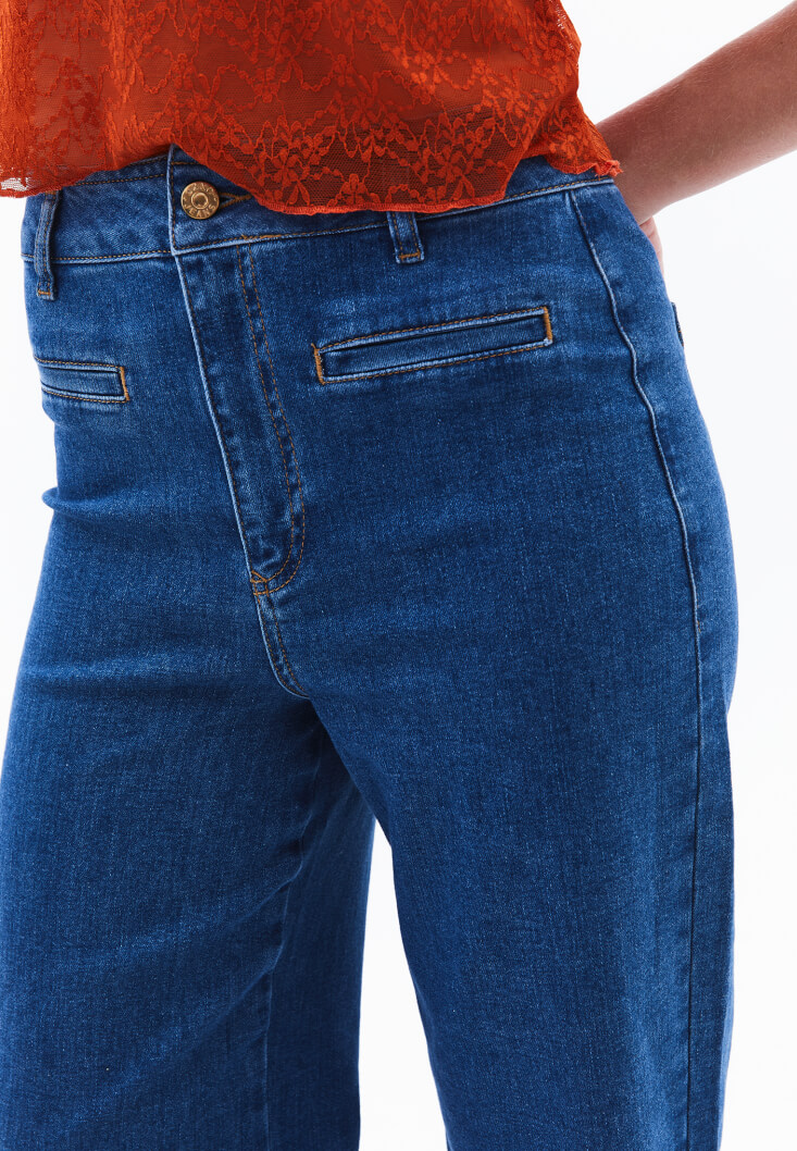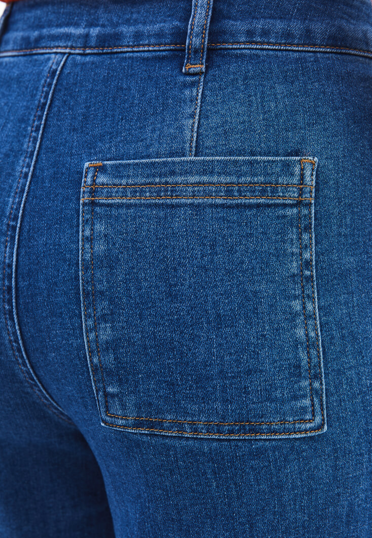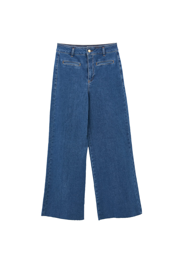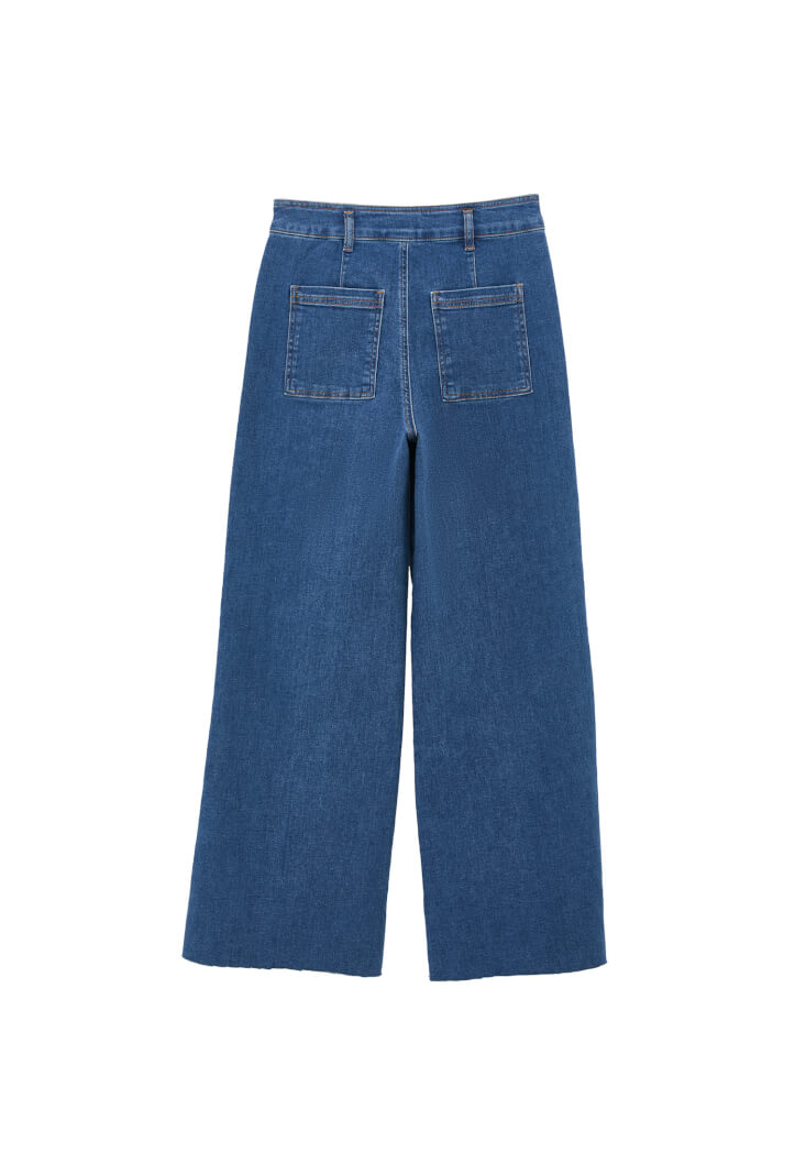 Pamuk karışımlı denim, ultra yüksek bel, bol paça, bedenden uzak rahat fit, kısa paça detaylı.