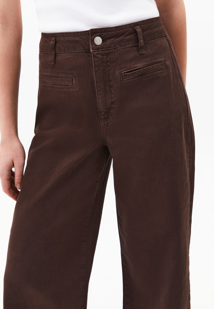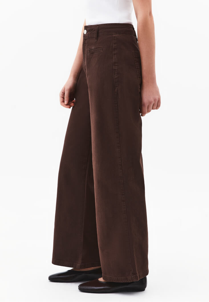 Pamuk karışımlı özel doku, bedenden uzak rahat fit, bol paça, ultra yüksek bel, ön kısmı cep görünümlü, arka kısmı iki cepli.