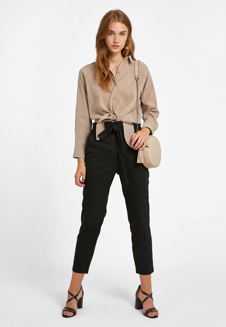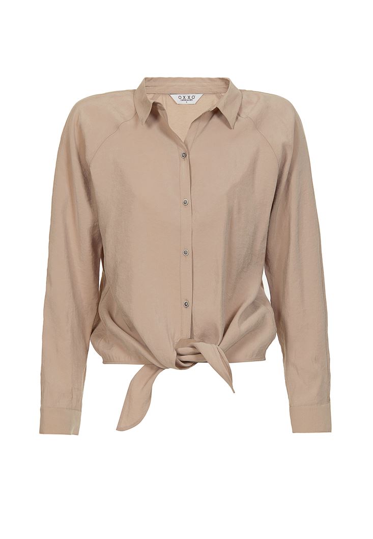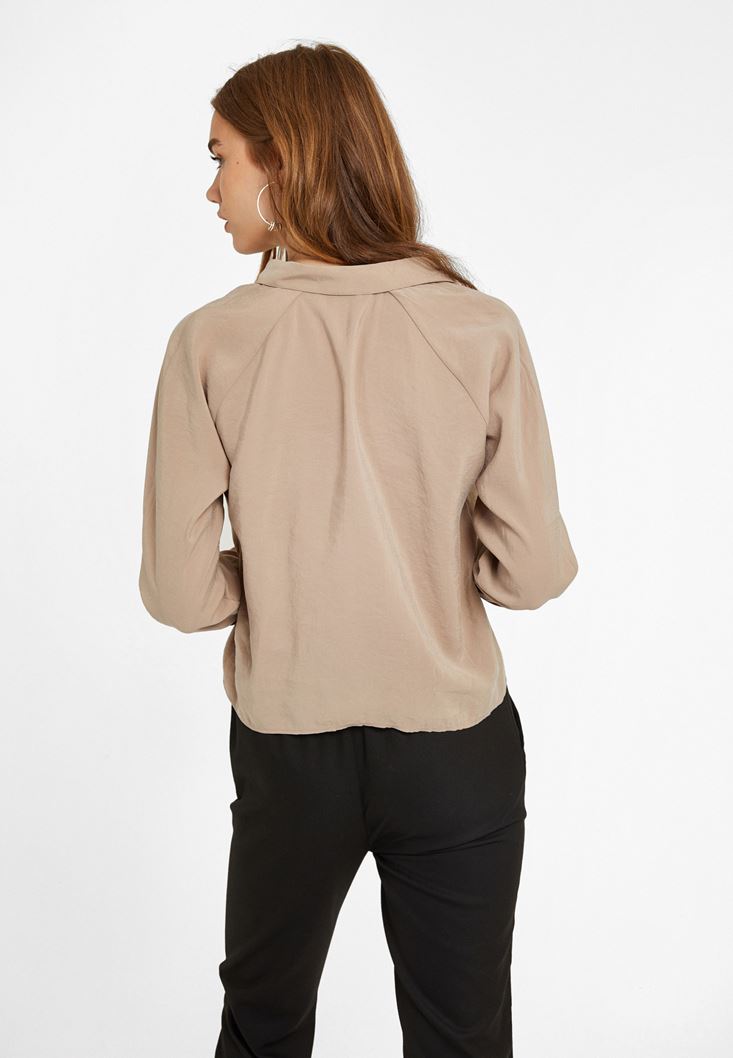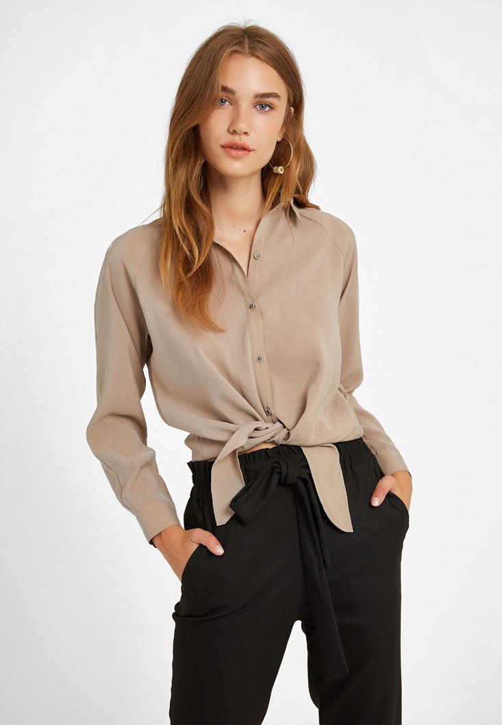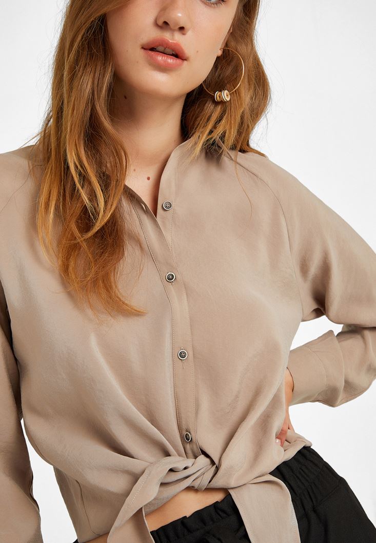 • Bayan Bej Uzun Kollu Bağlama Detaylı Gömlek ( MODAL )