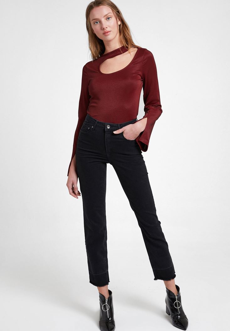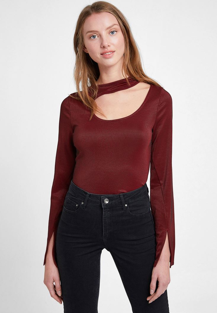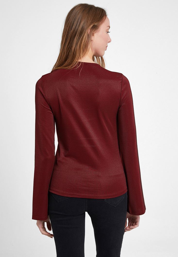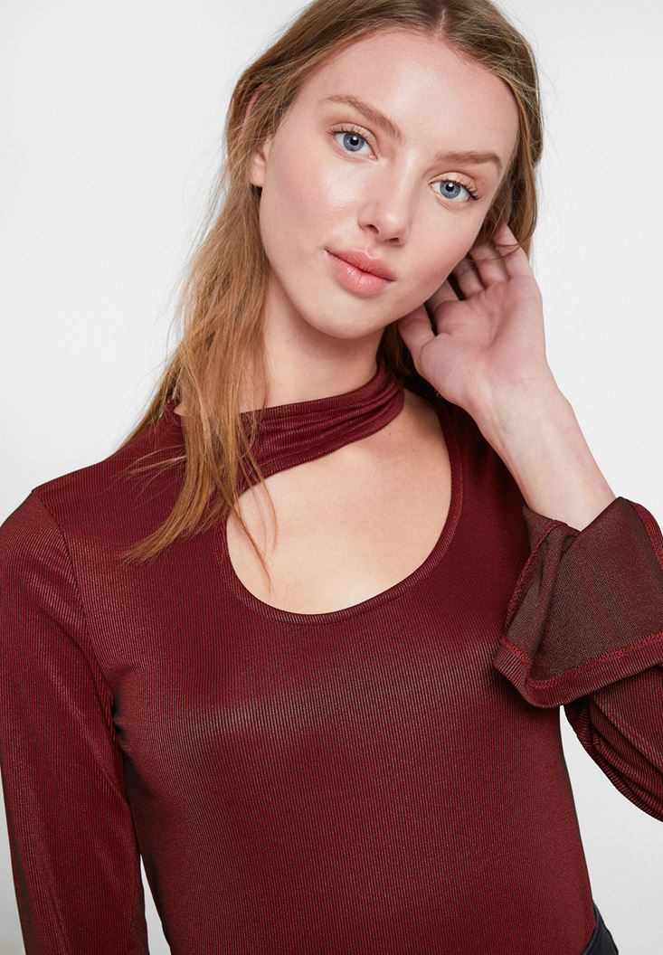 Bordo Uzun Kollu Cut Out Detaylı Bluz