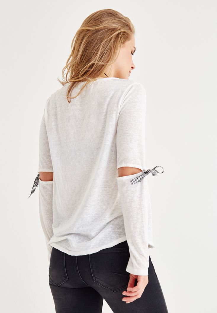 Krem Uzun Kollu Detaylı Tişört