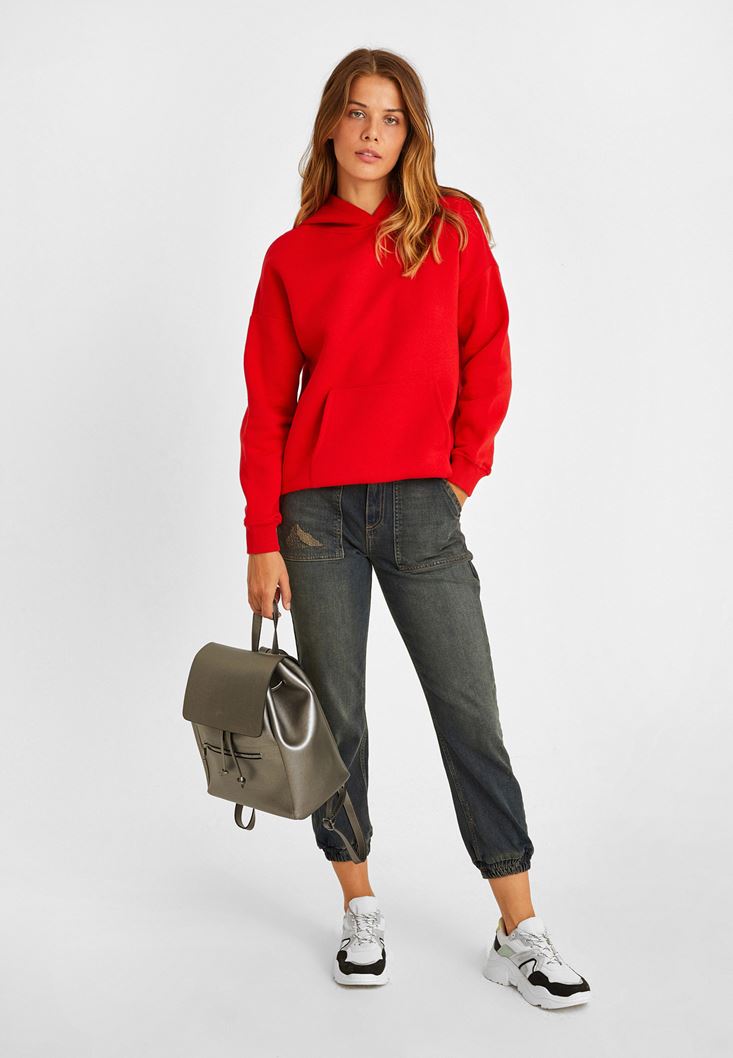 • Bayan Kırmızı Uzun Kollu Kapüşonlu Sweatshirt