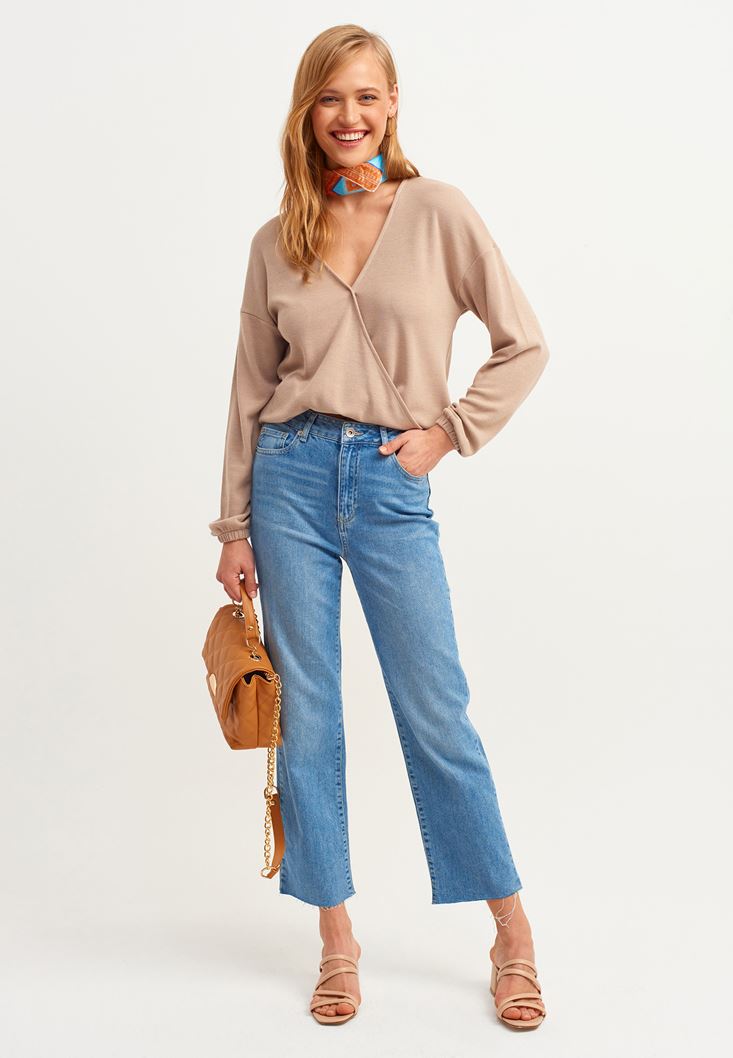 • Bayan Krem Uzun Kollu Kruvaze Bluz
