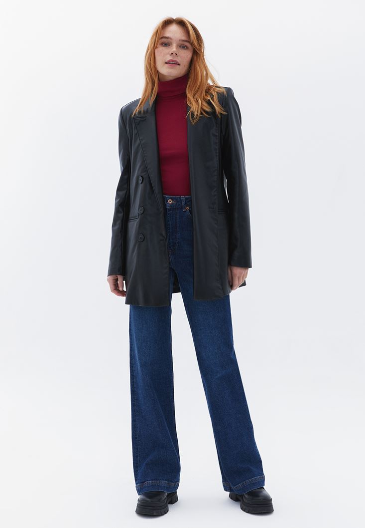 Pamuk içerikli özel doku, bedeni saran esnek fit, balıkçı yaka, uzun kollu, standart boy.