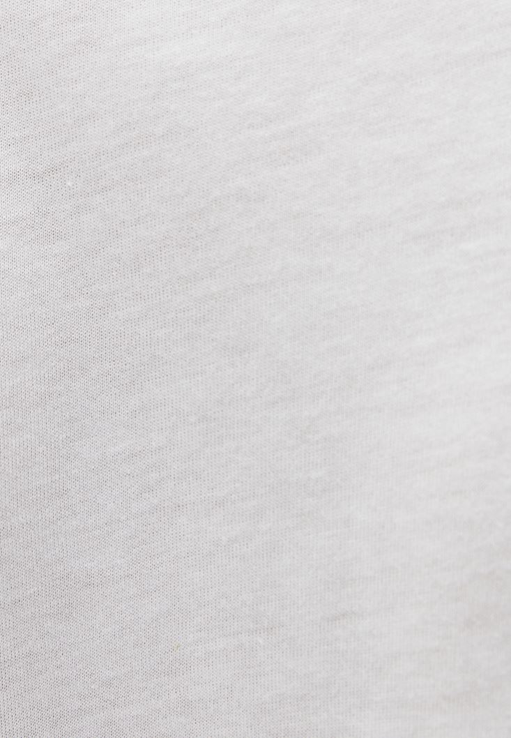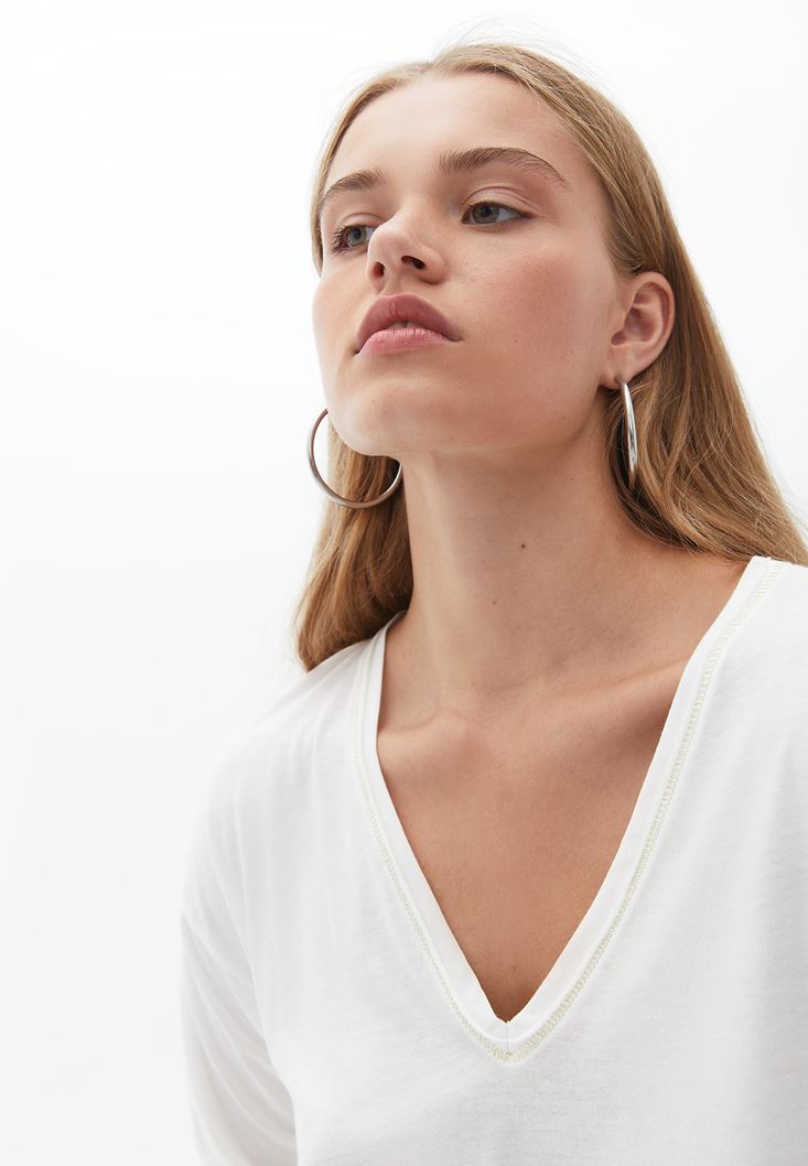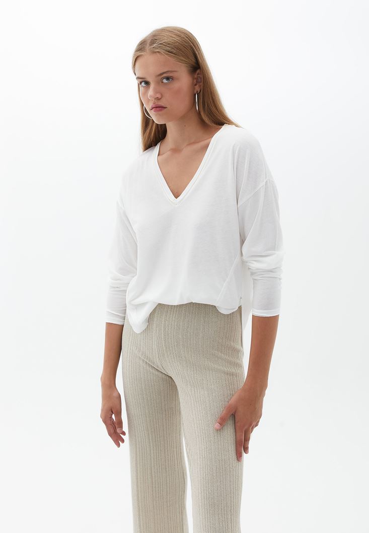 Krem Uzun Kollu V Yaka Tişört ( MODAL )