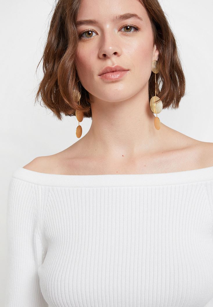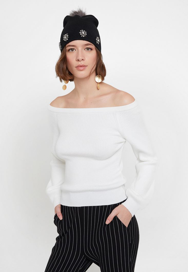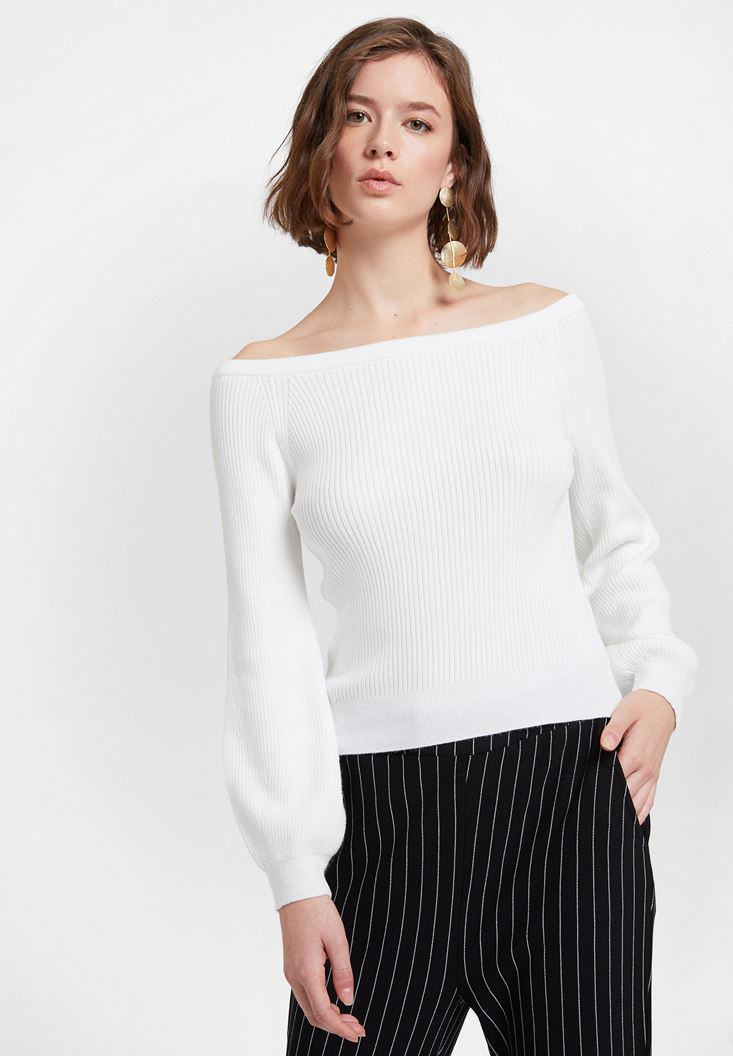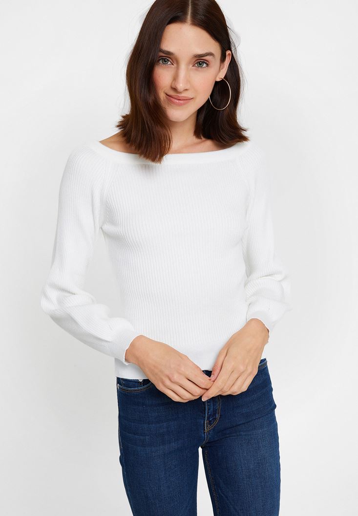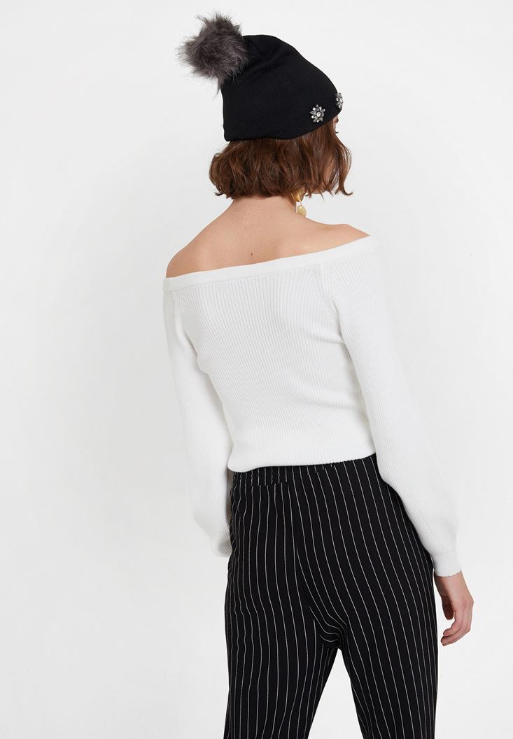 Krem Uzun Kollu Yakası Detaylı Triko