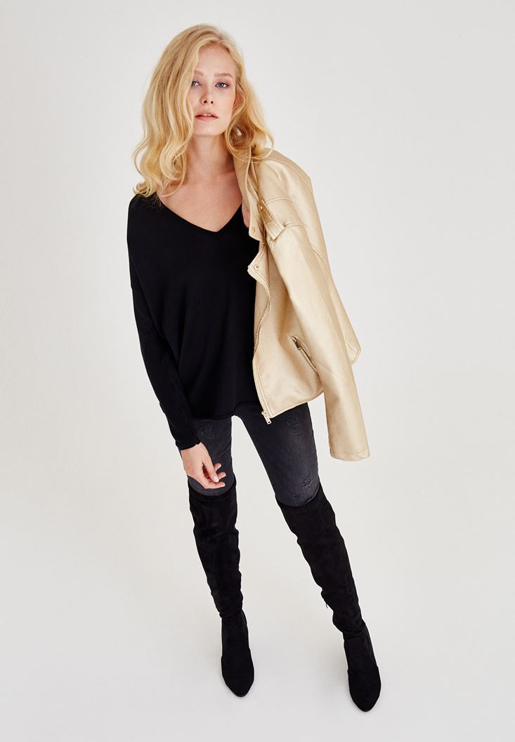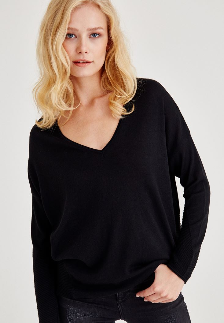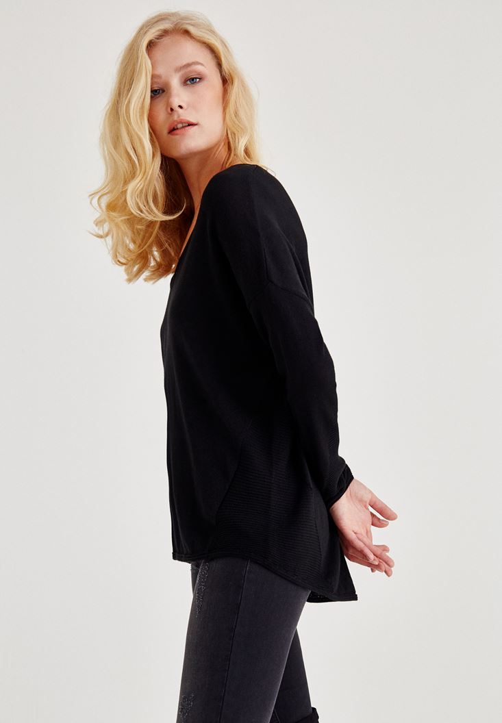 • Bayan Siyah Uzun Kollu Yanları Detaylı Triko