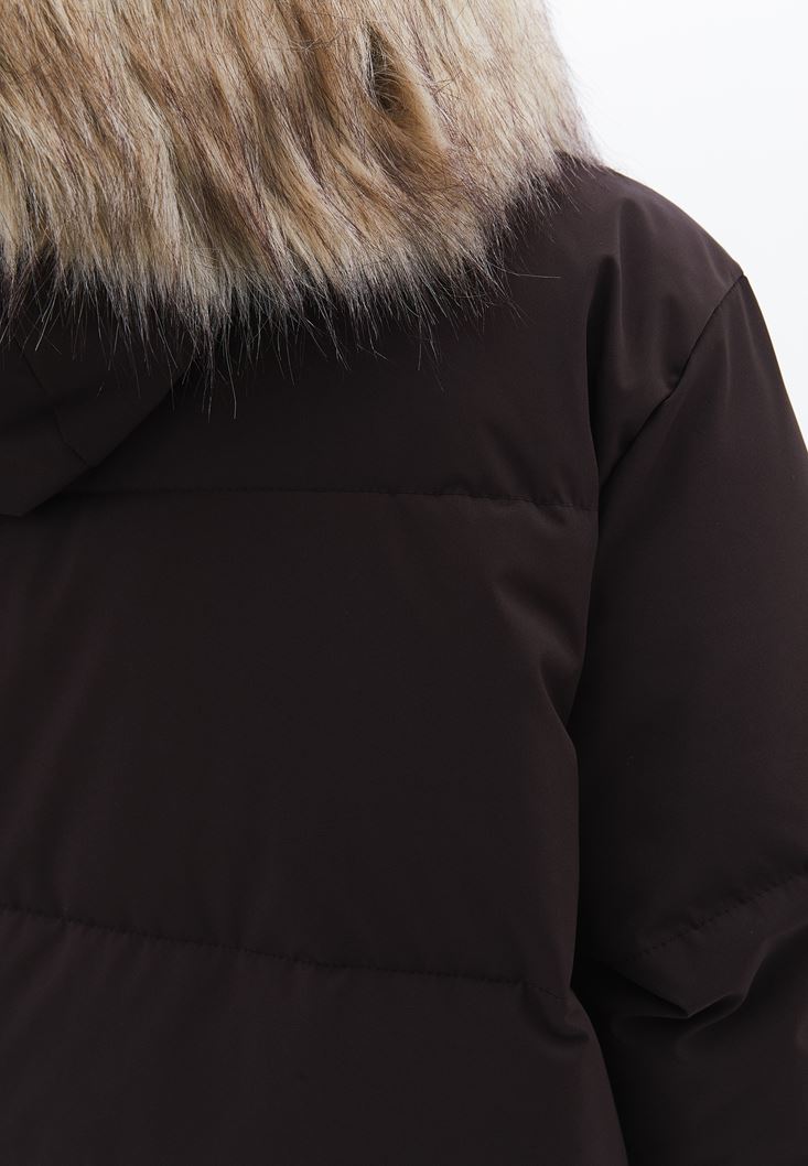 Kahverengi Uzun Kürk Yaka Puf Mont