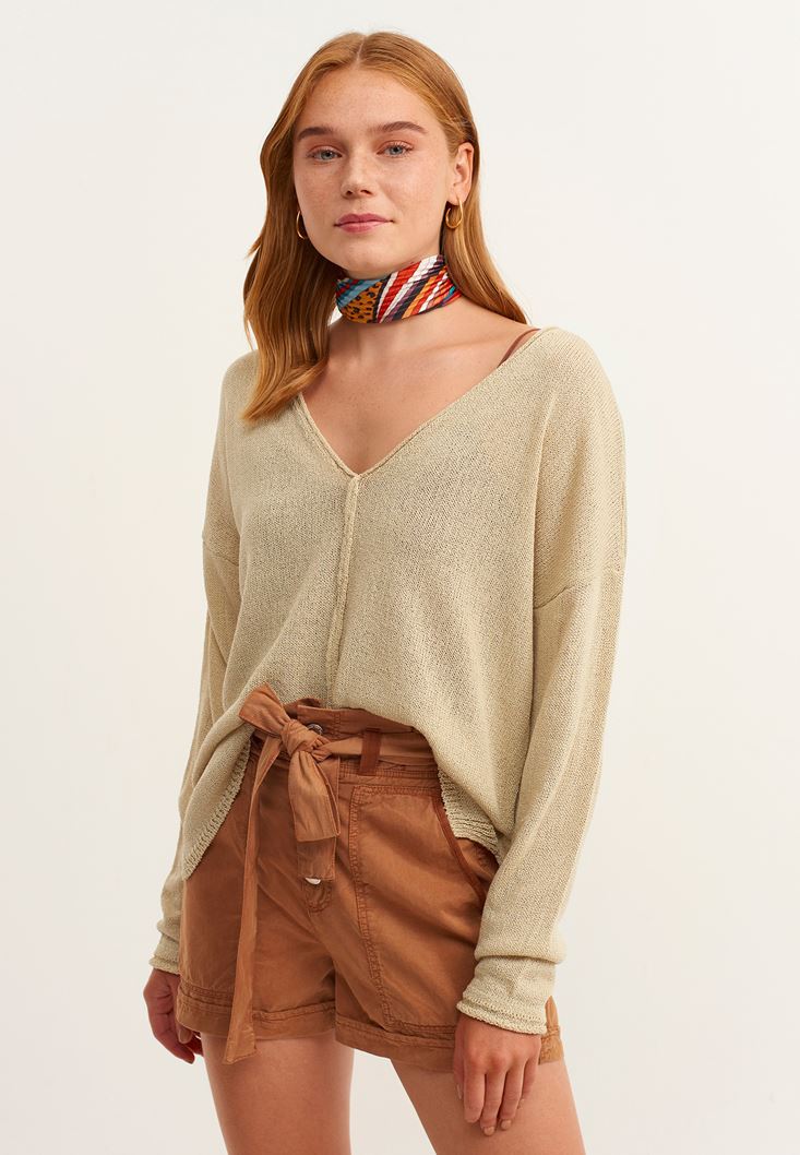 Bej V-Neck Triko