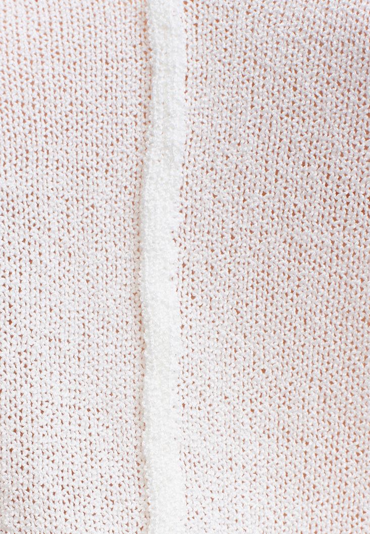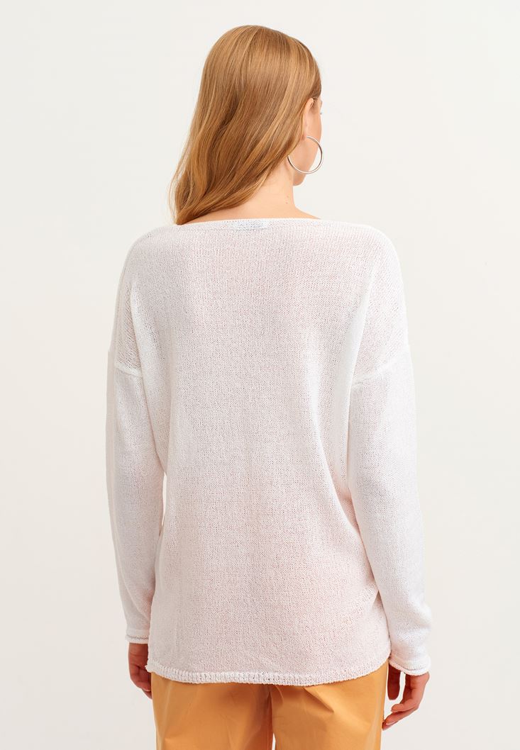 Yumuşak özel triko doku, V yaka, ön kısmı dikiş detaylı, bedenden uzak oversize kalıp, önü kısa arkası uzun asimetrik kesim, uzun kollu.