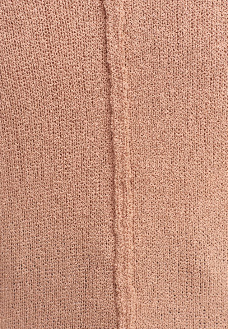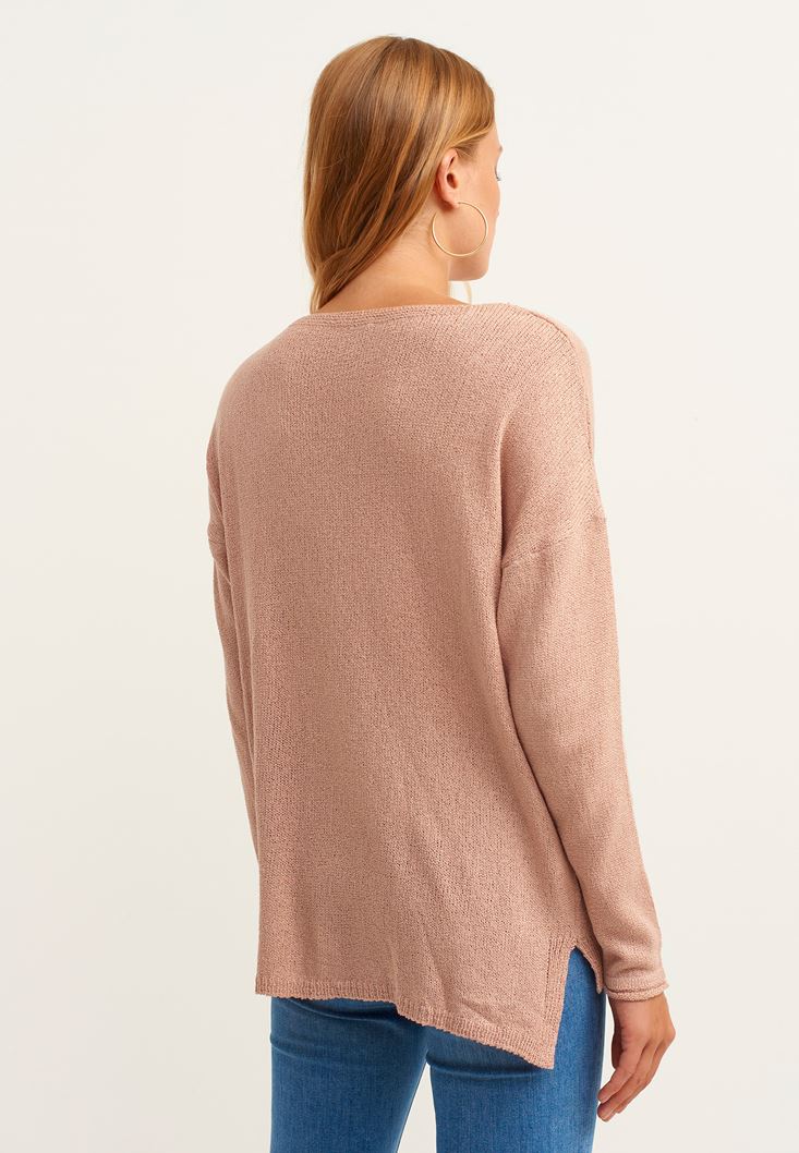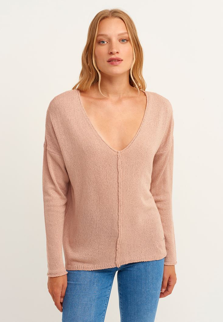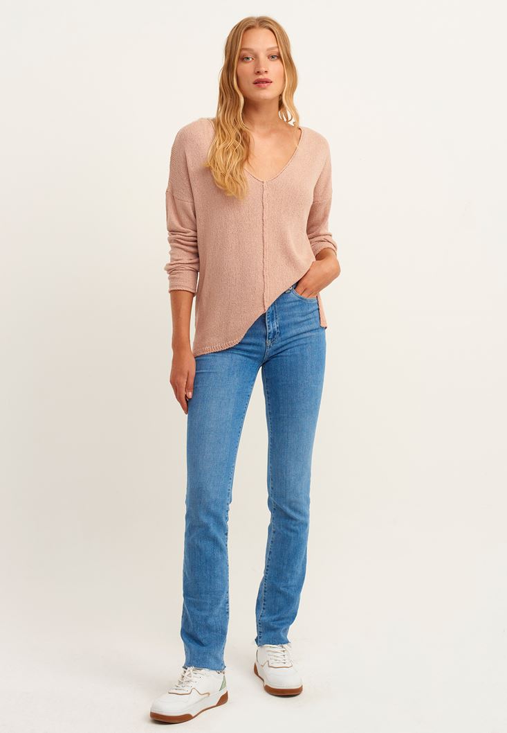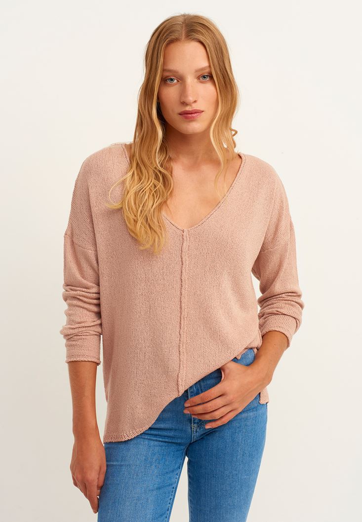 Yumuşak özel triko doku, V yaka, ön kısmı dikiş detaylı, bedenden uzak oversize kalıp, önü kısa arkası uzun asimetrik kesim, uzun kollu.