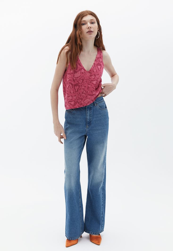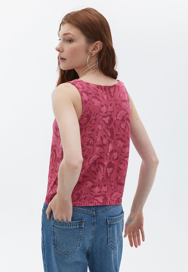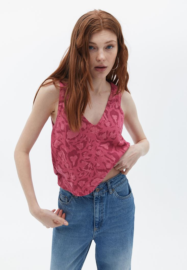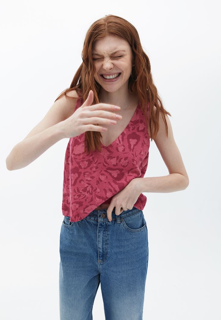 Pamuk karışımlı triko, V yaka, desenli tasarım, bedenden uzak rahat fit.