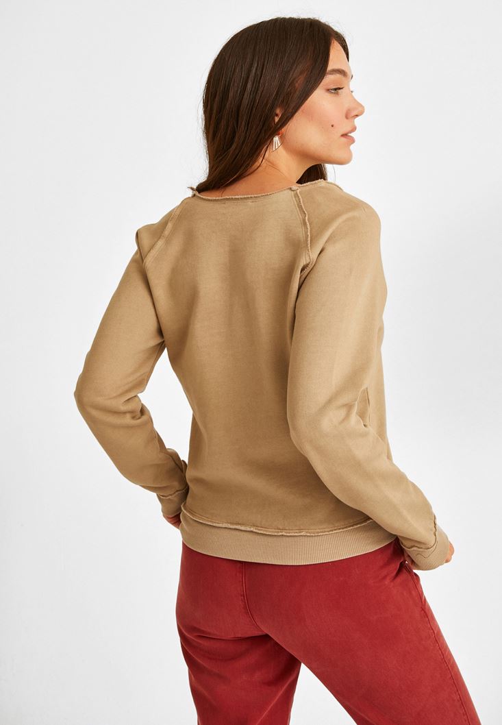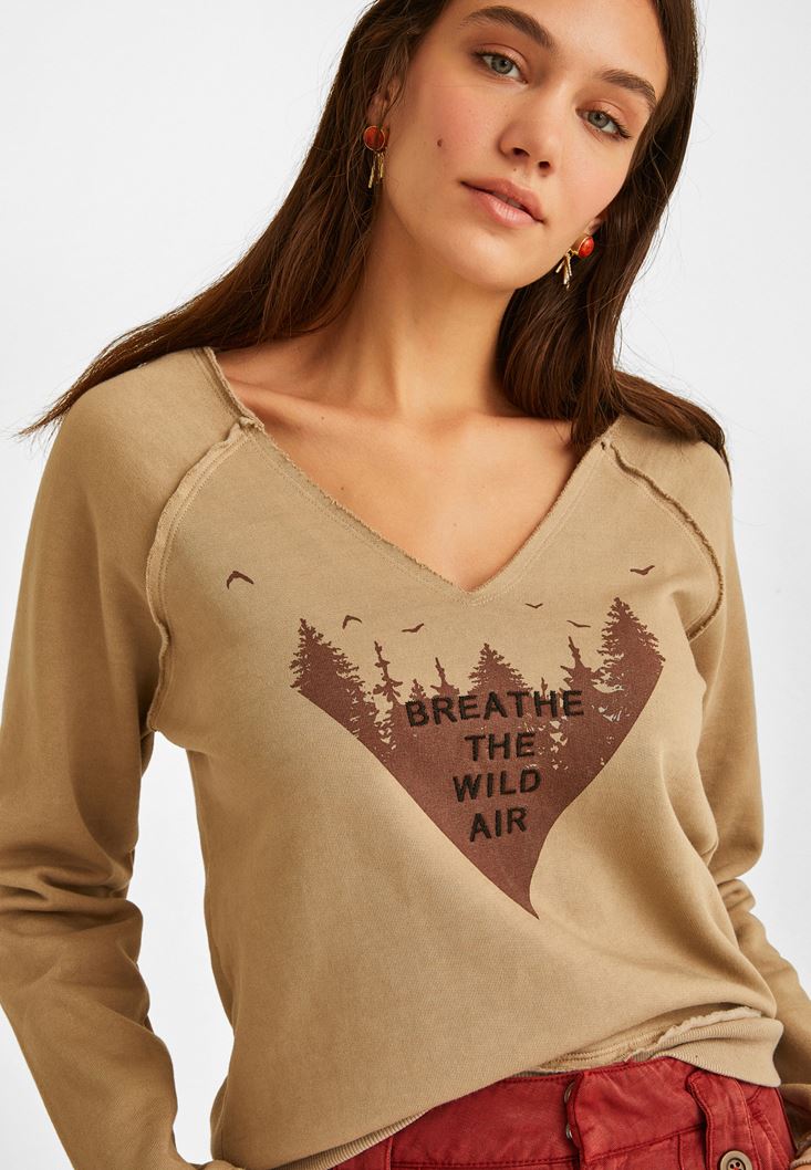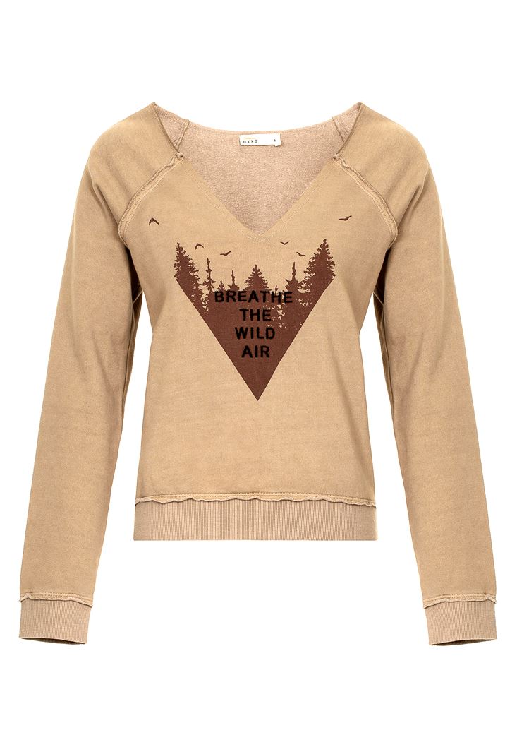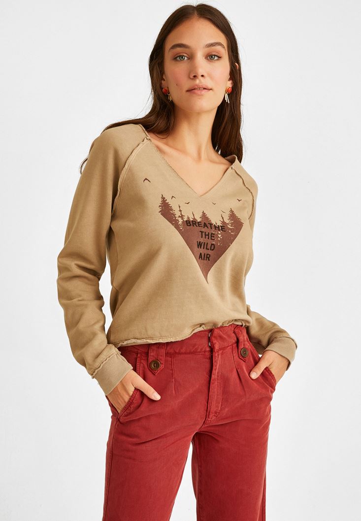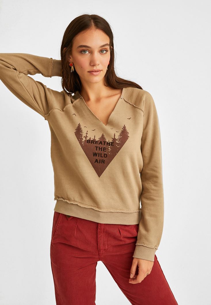 • Bayan Bej V Yaka Baskılı Sweatshirt