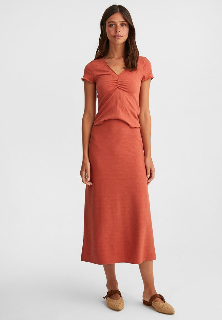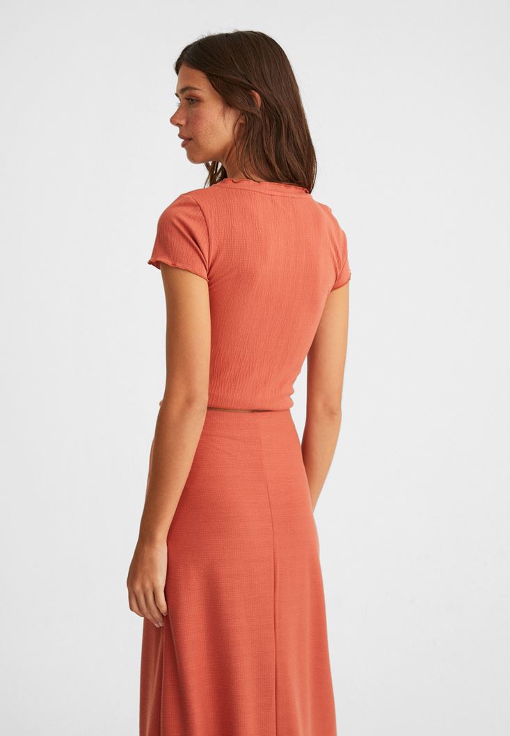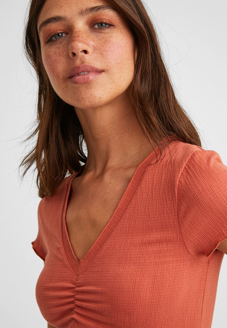 V Yaka Bluz modeli zarafeti ve dikkat çekici dokusu ile kombinlerinizde yer vermekten keyif alacağınız çok özel kadın bluz modelleri arasında kolayca fark edeceğiniz bir parça. V yaka kesimi ve bu yaka kesimini başarılı bir şekilde ön plana çıkaran biye detayları ile zarif bir enerji kazanan kadın bluz modeli aynı zamanda göğüs kısmında yer alan büzgü detayı ile de duruşunu başarılı bir şekilde güçlendiriyor. Tasarımın bel kesiminde kullanılan fırfır detaylar bu parçanın zarafetinin hoş bir hareketlilikle buluşmasına yardımcı oluyor. Viskon lifinin nefes alan yapısı ve yüksek nem emiciliği sayesinde her zaman rahat hissetmenize yardımcı olacak, OXXO ilhamını başarılı bir şekilde yansıtan parçalardan birisi.