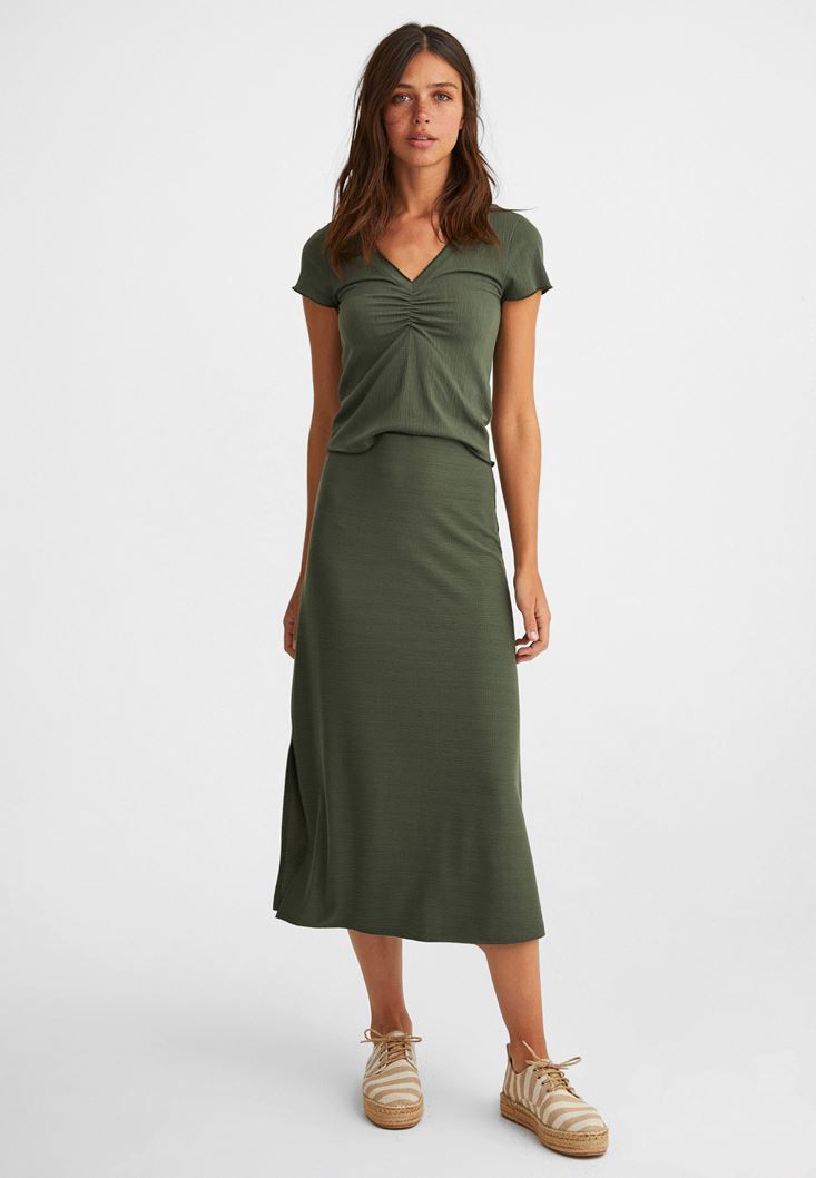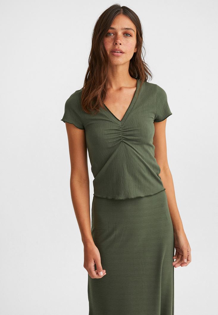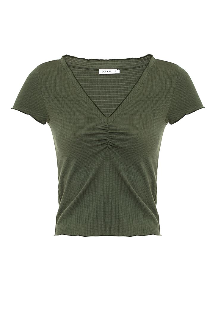 V Yaka Bluz modeli zarafeti ve dikkat çekici dokusu ile kombinlerinizde yer vermekten keyif alacağınız çok özel kadın bluz modelleri arasında kolayca fark edeceğiniz bir parça. V yaka kesimi ve bu yaka kesimini başarılı bir şekilde ön plana çıkaran biye detayları ile zarif bir enerji kazanan kadın bluz modeli aynı zamanda göğüs kısmında yer alan büzgü detayı ile de duruşunu başarılı bir şekilde güçlendiriyor. Tasarımın bel kesiminde kullanılan fırfır detaylar bu parçanın zarafetinin hoş bir hareketlilikle buluşmasına yardımcı oluyor. Viskon lifinin nefes alan yapısı ve yüksek nem emiciliği sayesinde her zaman rahat hissetmenize yardımcı olacak, OXXO ilhamını başarılı bir şekilde yansıtan parçalardan birisi.
