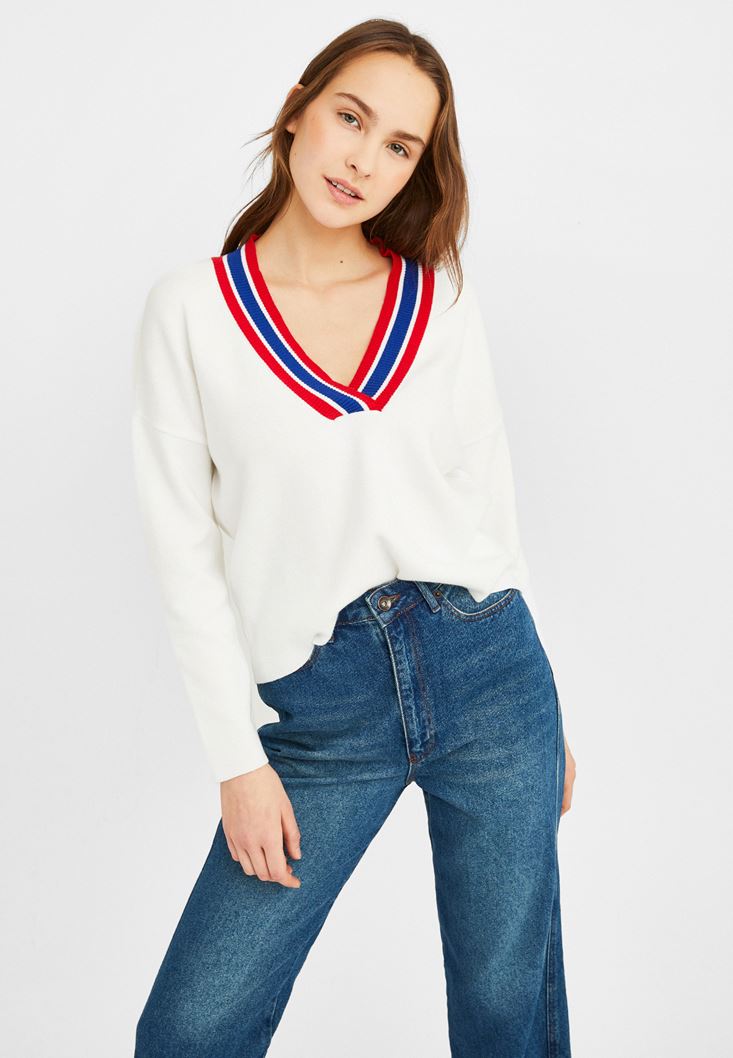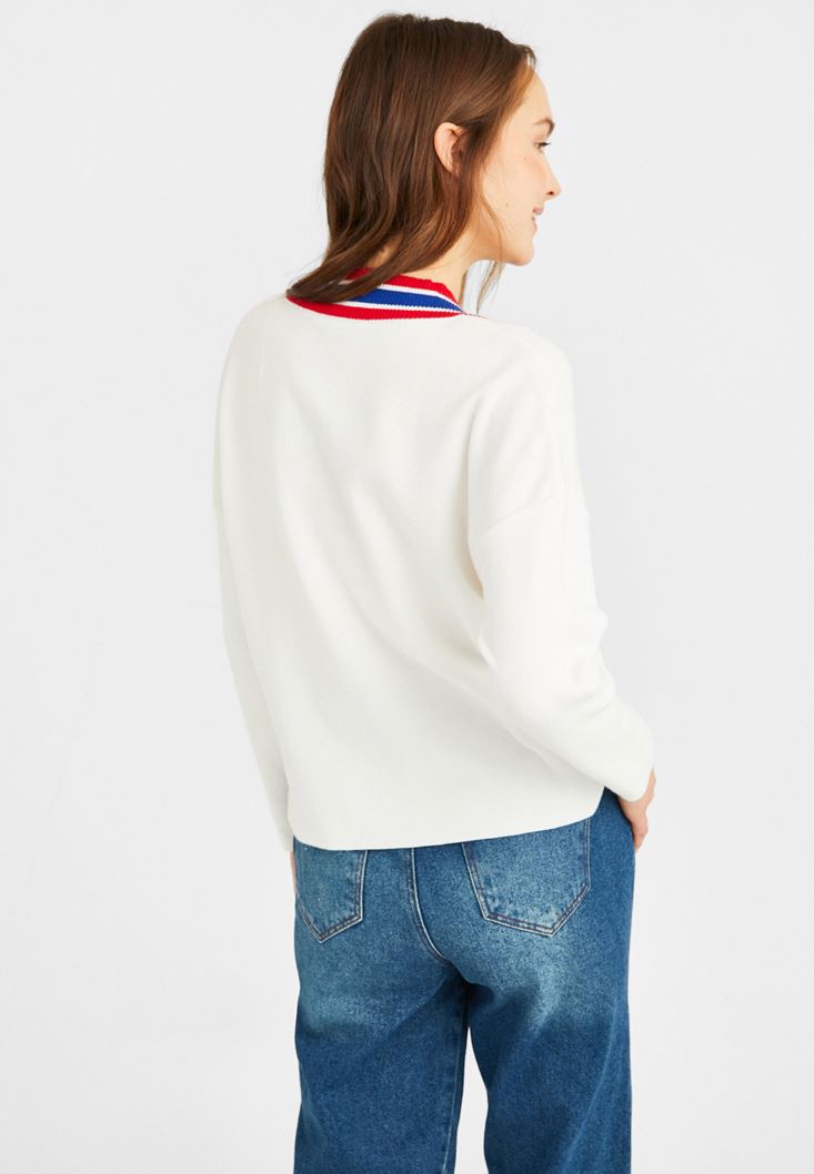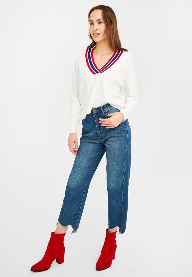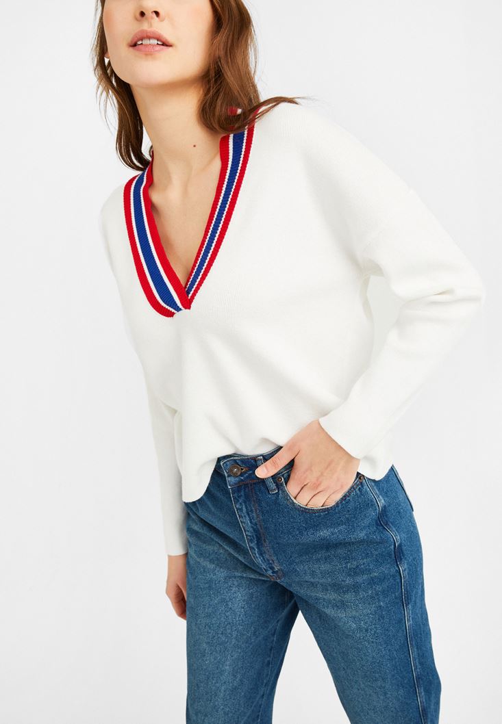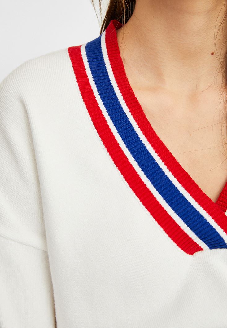 • Bayan Krem V Yaka Çizgi Detaylı Triko