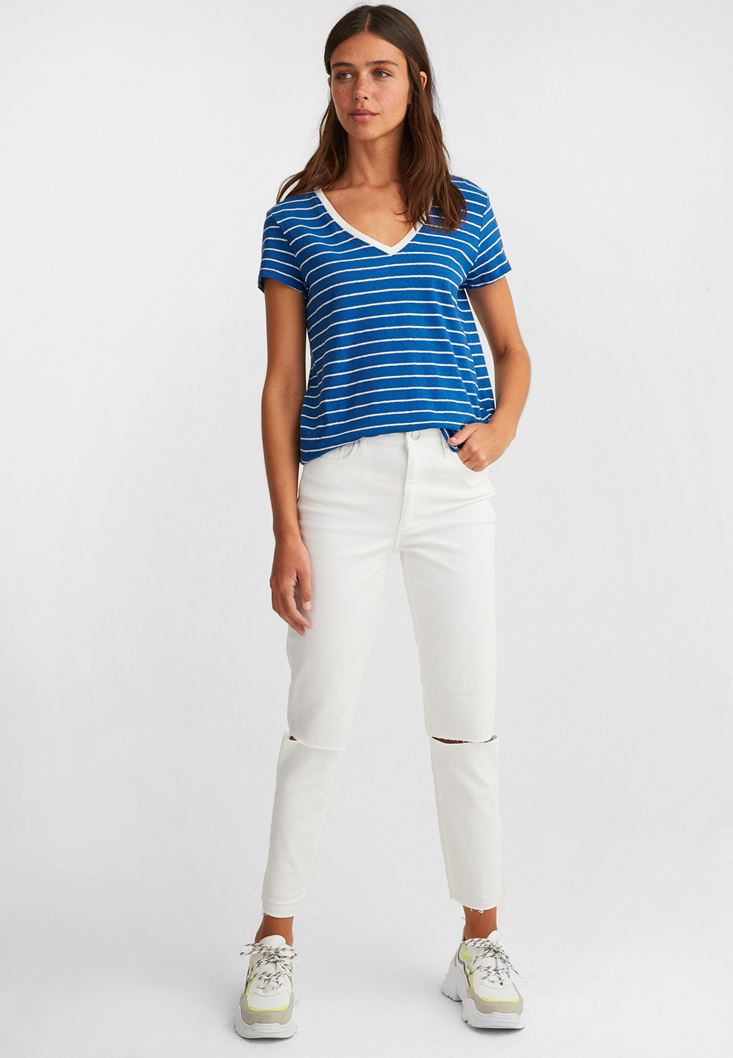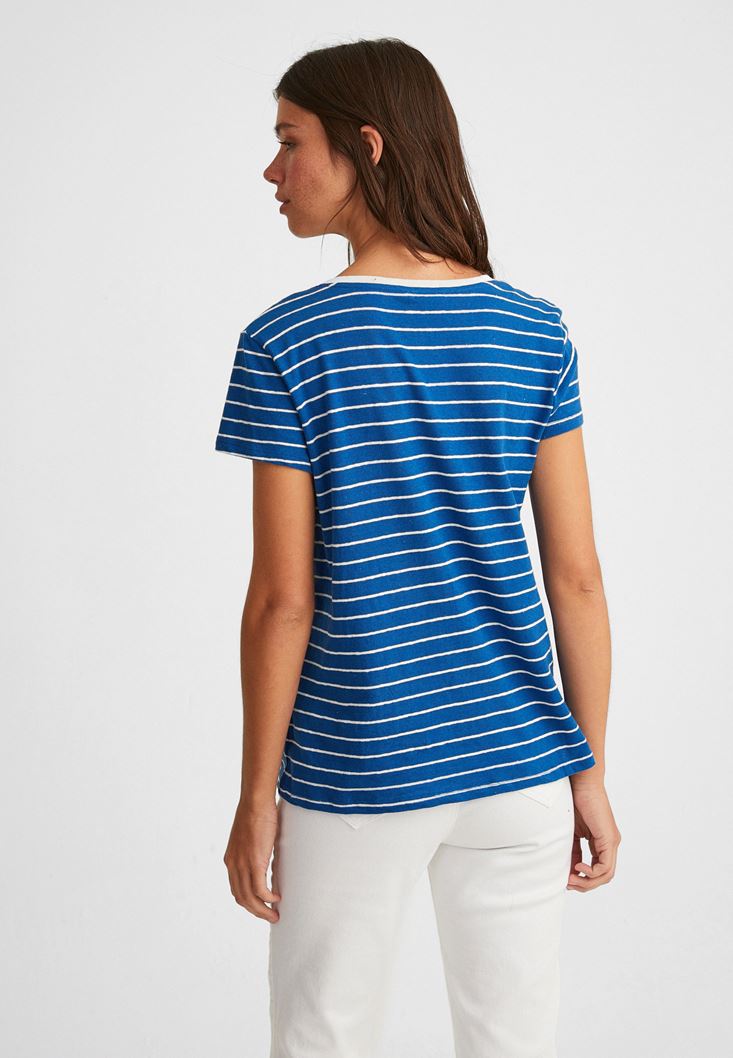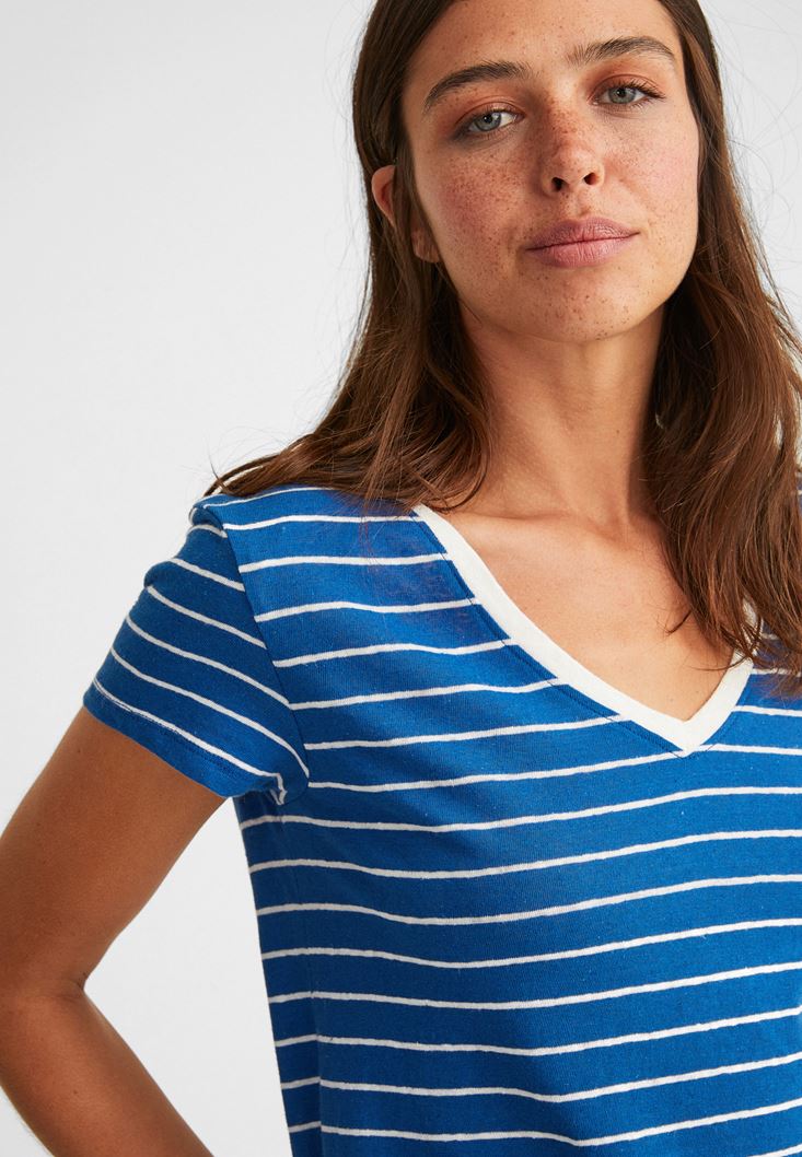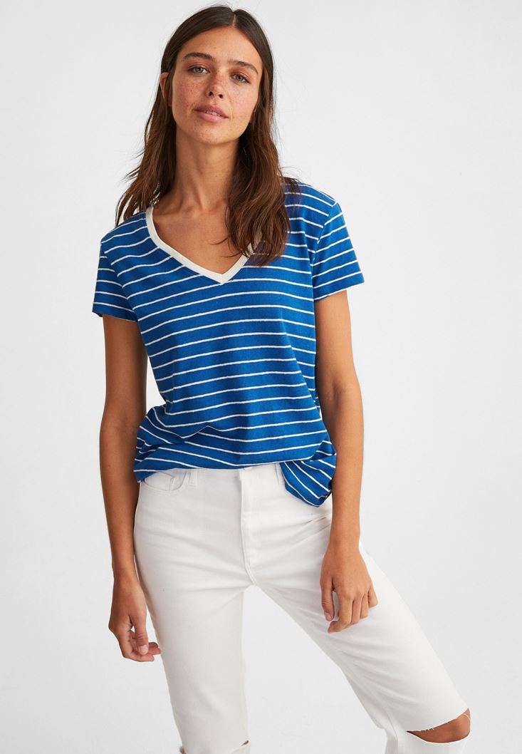 • Bayan Mavi V Yaka Çizgili Keten Tişört