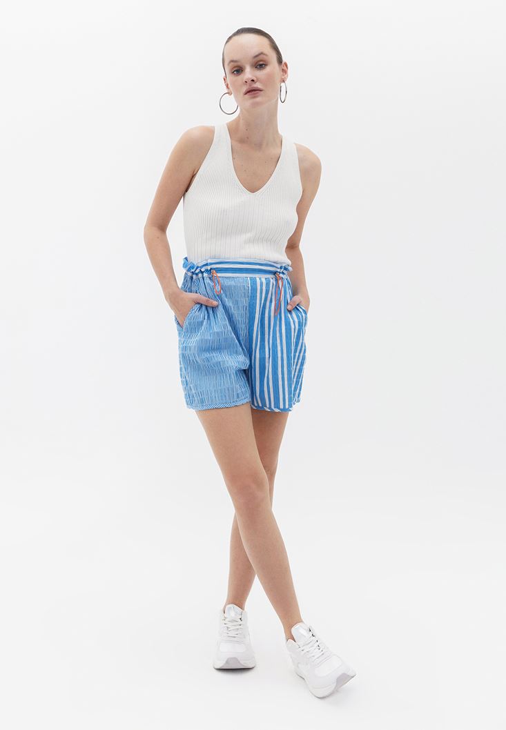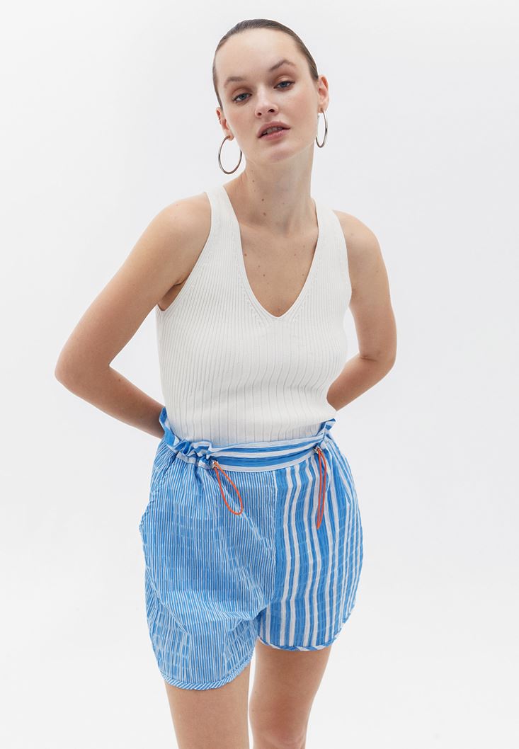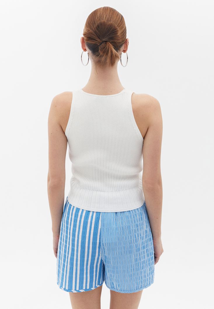 Viskon karışımlı triko, V yaka, kalın askılı, crop kesim, fitilli örgü.
