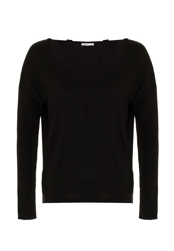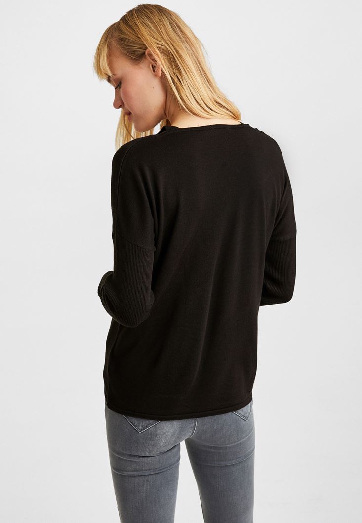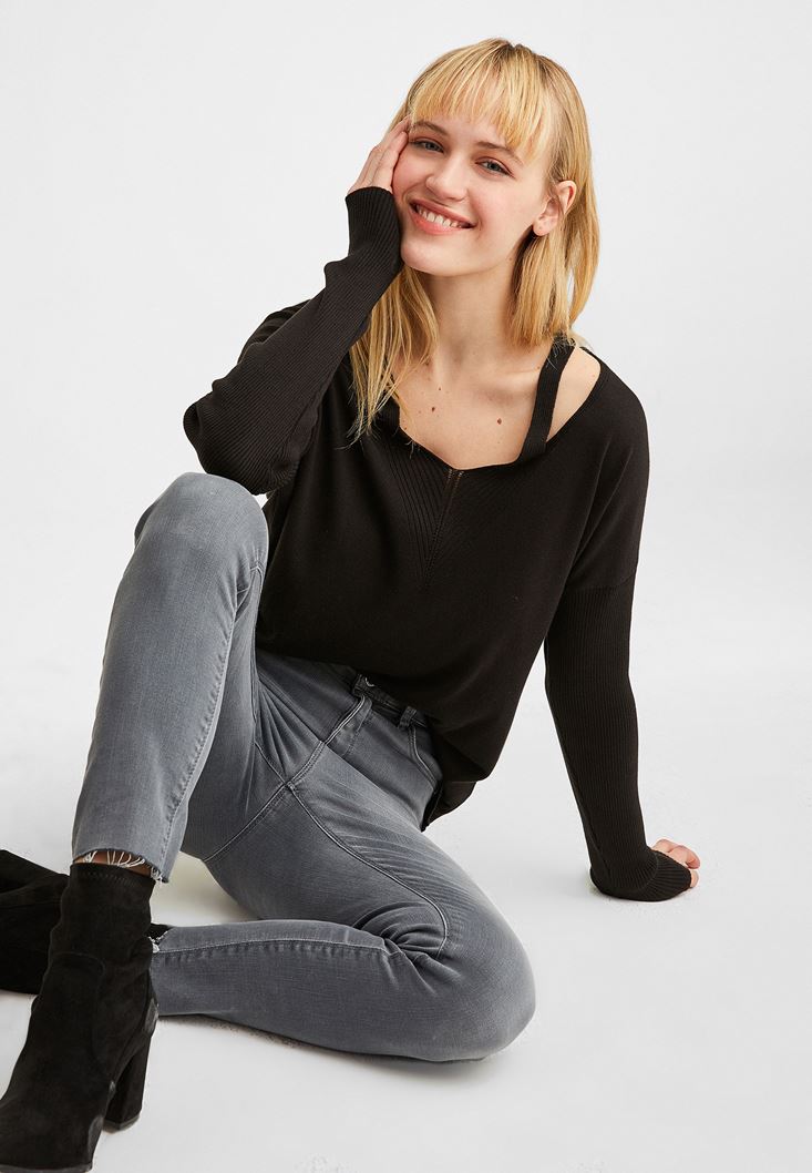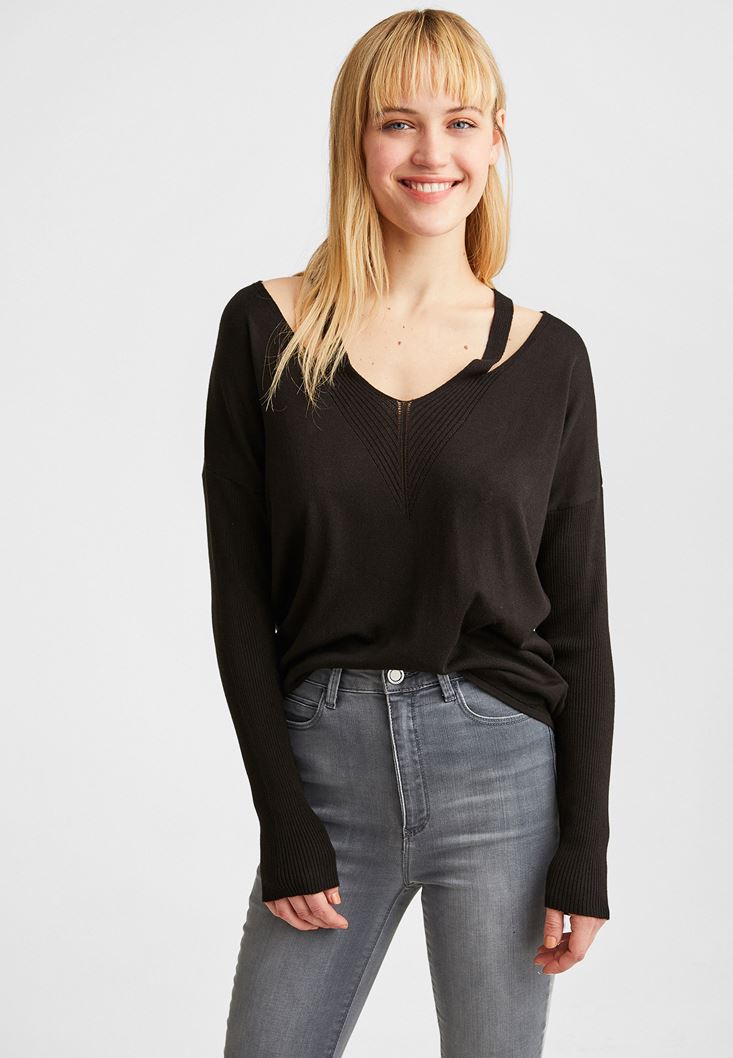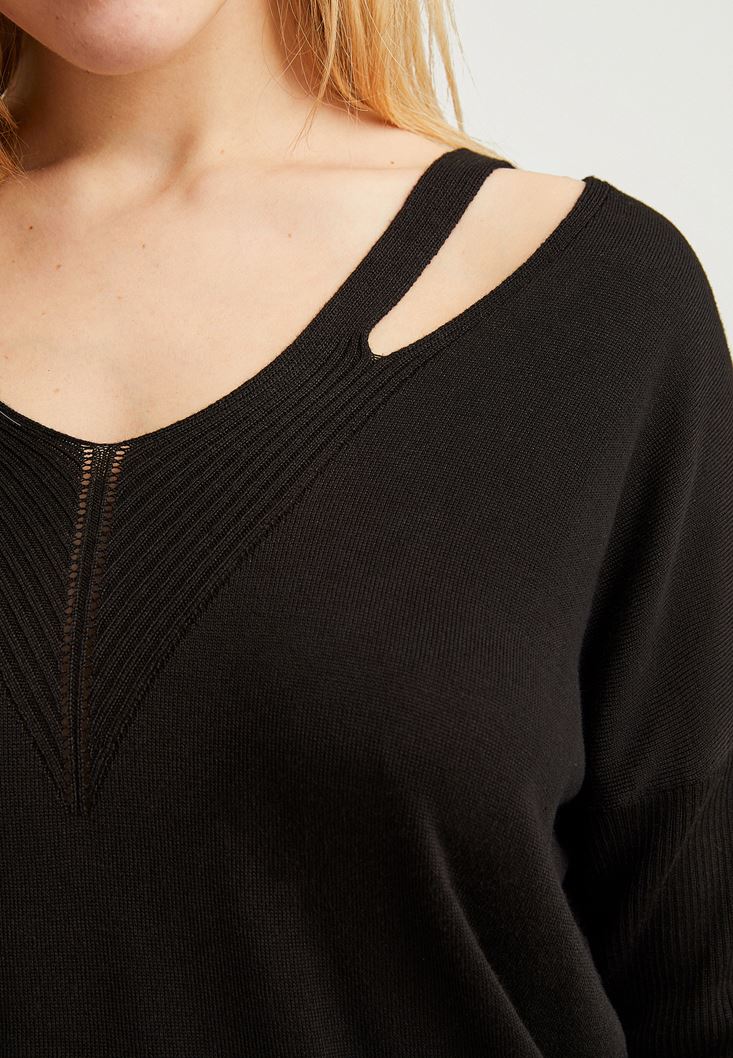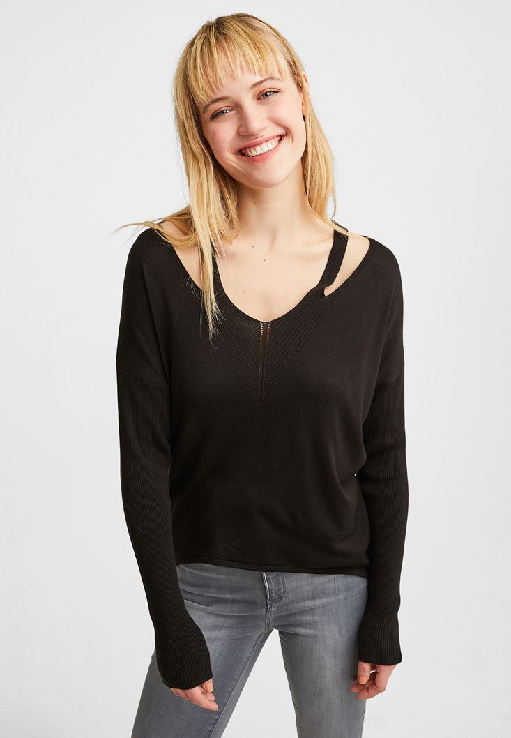Siyah V Yaka Cut Out Detaylı Kazak