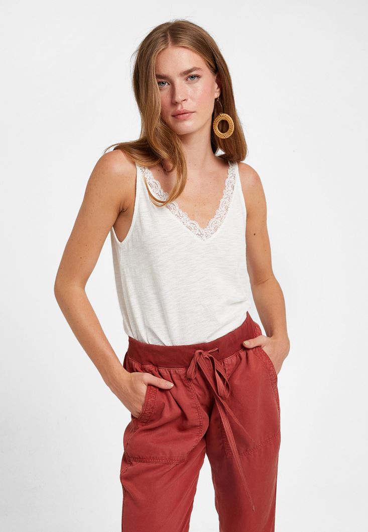 Krem V Yaka Dantel Detaylı Atlet