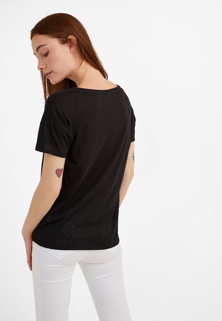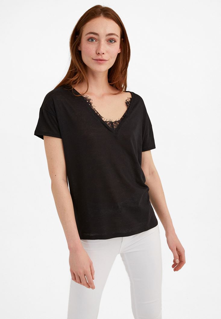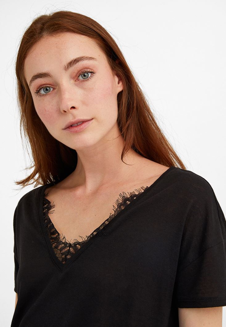 • Bayan Siyah V Yaka Dantel Detaylı Tişört