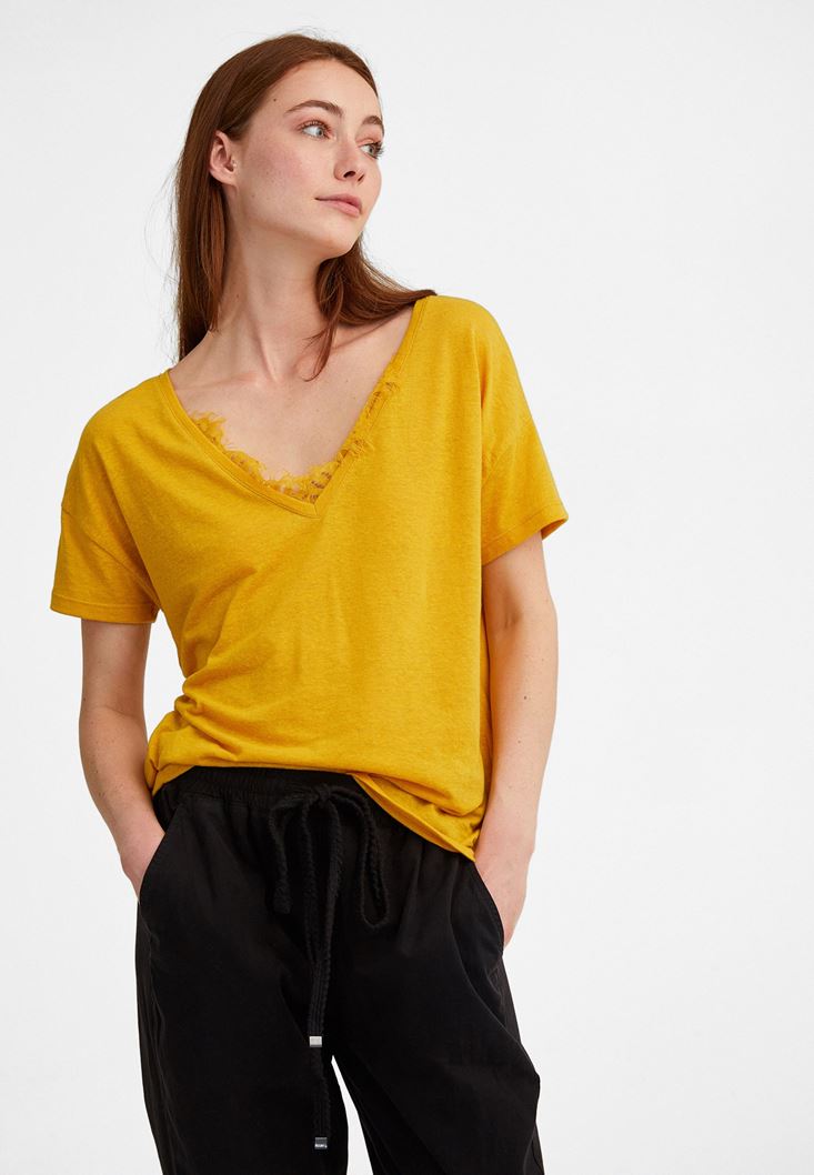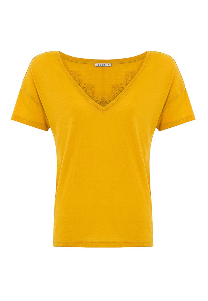 • Bayan Sarı V Yaka Dantel Detaylı Tişört
