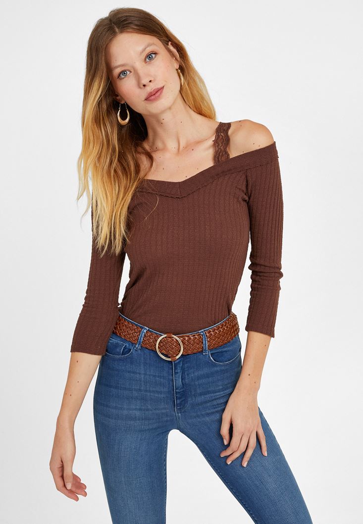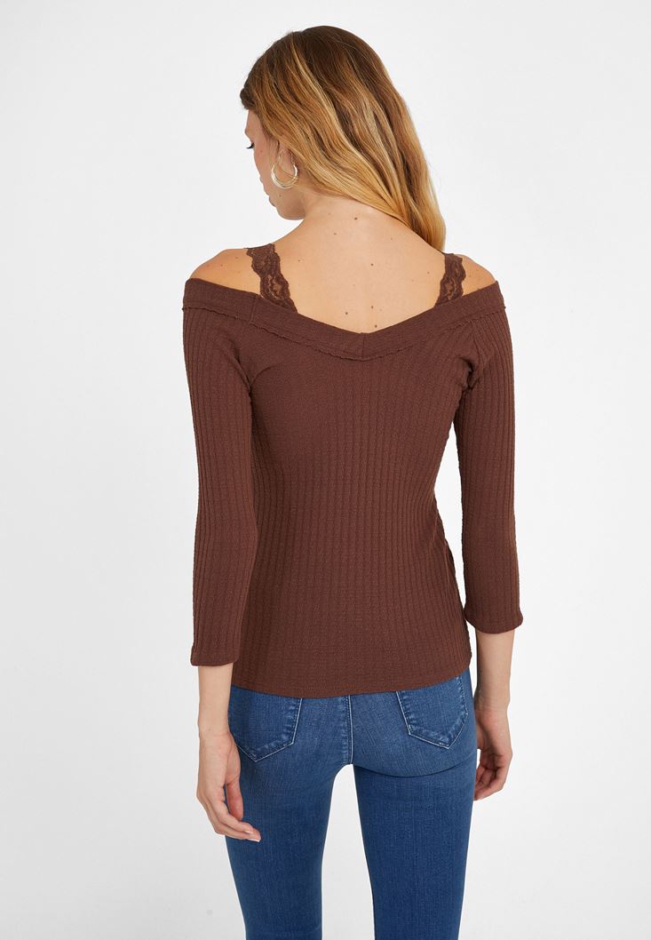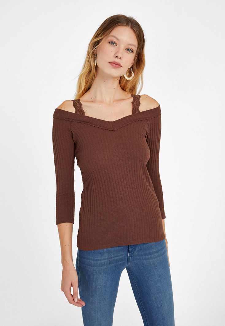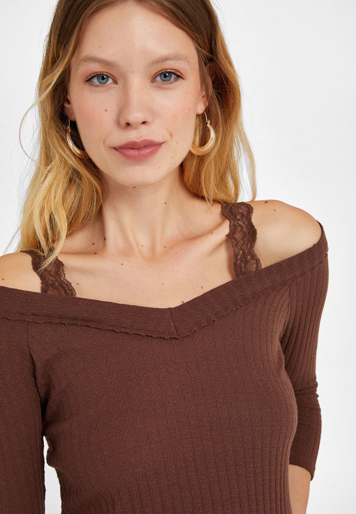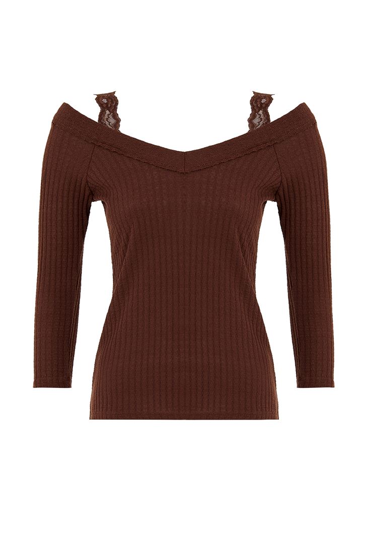 • Bayan Kahverengi V Yaka Dantel Detaylı Triko