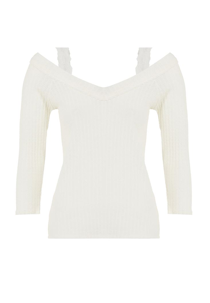 • Bayan Krem V Yaka Dantel Detaylı Triko