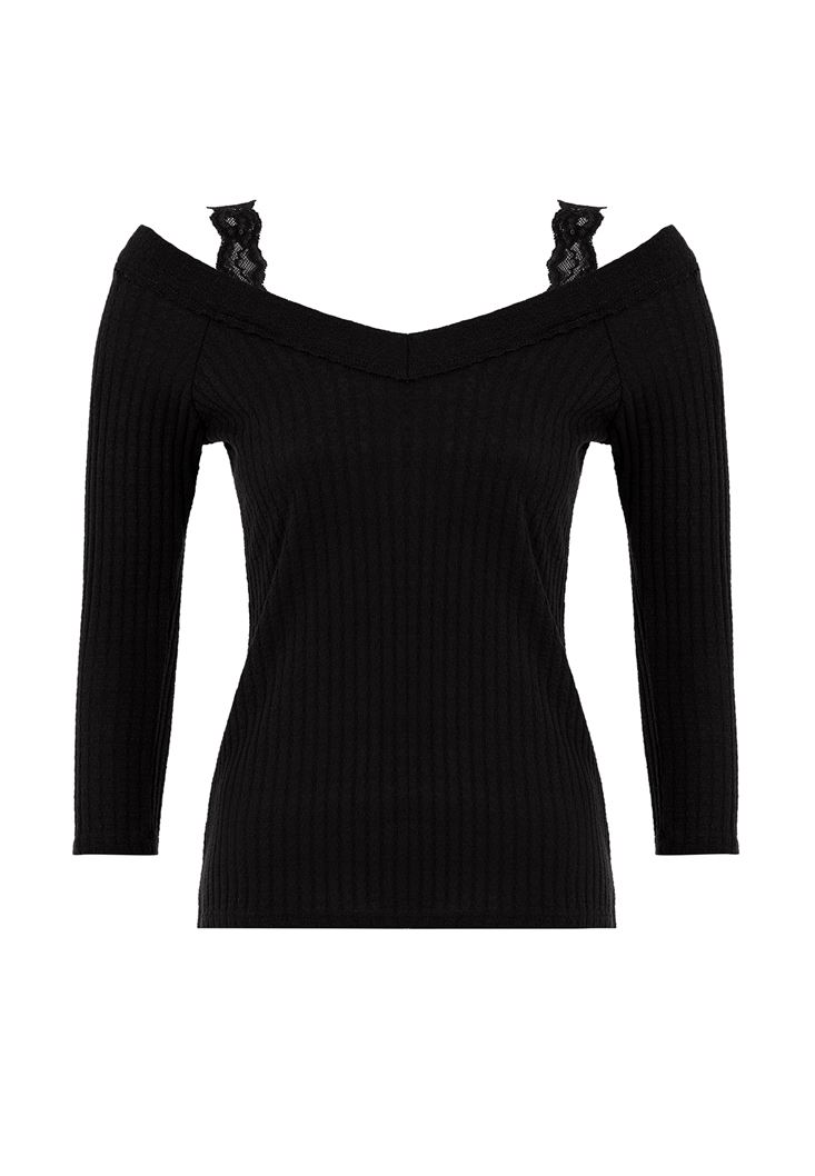 • Bayan Siyah V Yaka Dantel Detaylı Triko