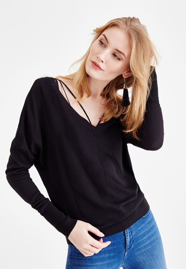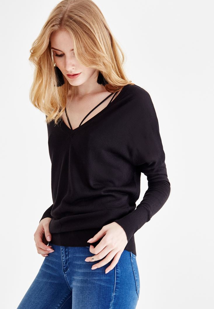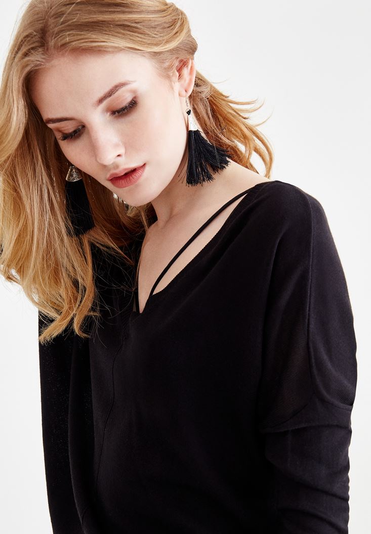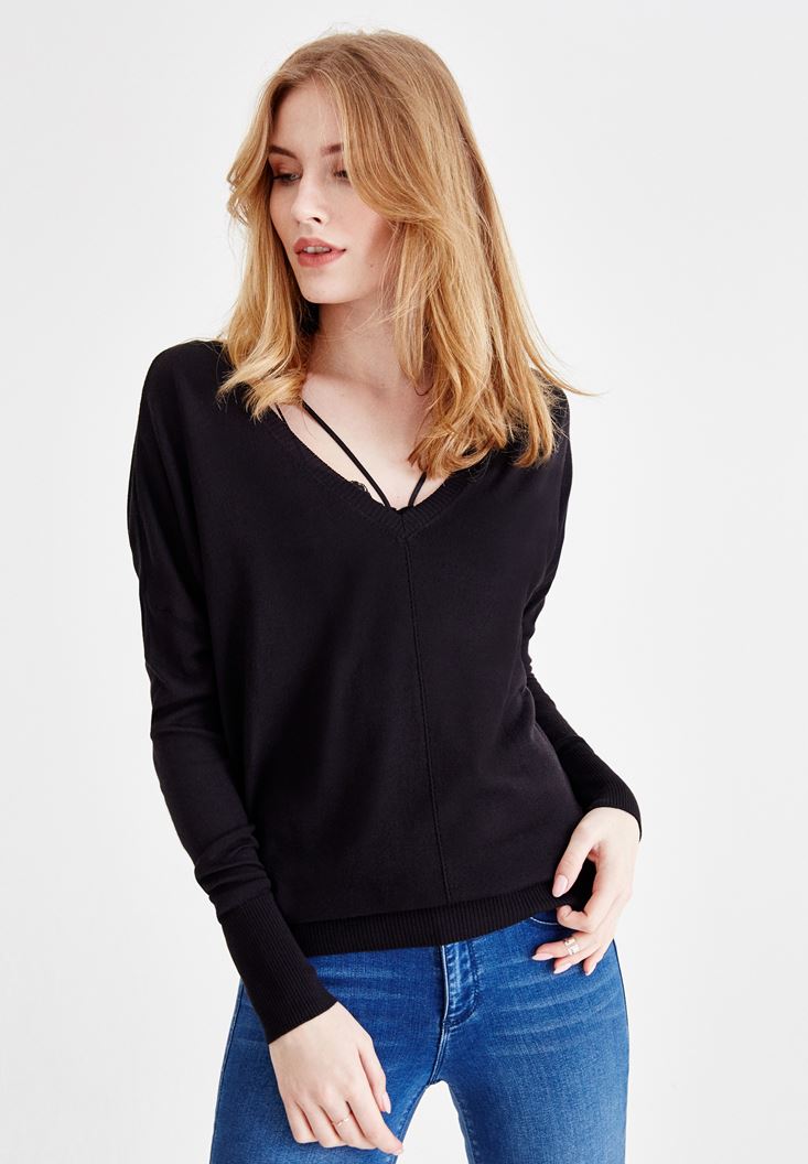 • Bayan Siyah V Yaka Detaylı Uzun Kollu Triko
